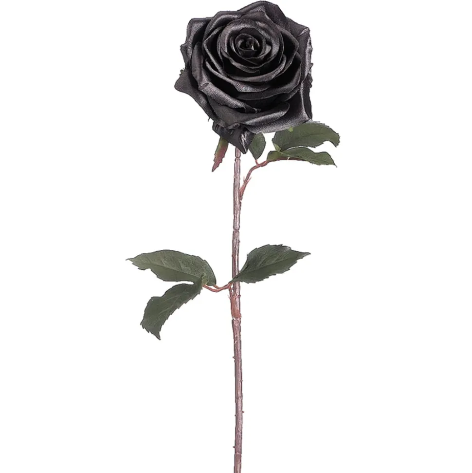 Artificial black rose, 21,5″. With this black flower, you can build a shabby-chic floral arrangement for any season. Put it in a vase along with other vibrant colored rose and peony stems for an unexpected turn on traditional flower bouquets. It will add a dramatic look and some character in your compositions.