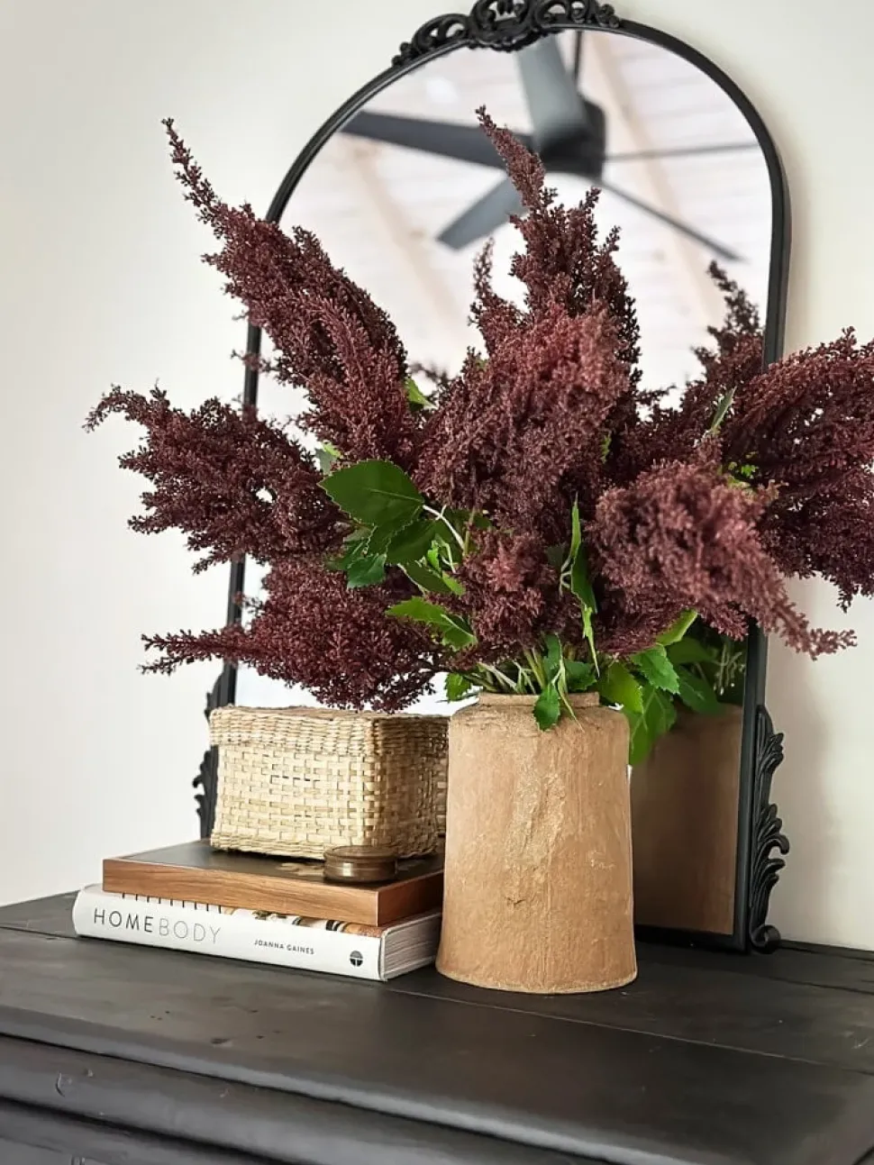 Astilbe mauve-bourgogne artificielle, 33''. Create a moody floral bouquet by combining this dark colored astilbe with white flowers! For a more dramatic look, you could also choose to mix in some dried flowers. Also available in yellow-orange.