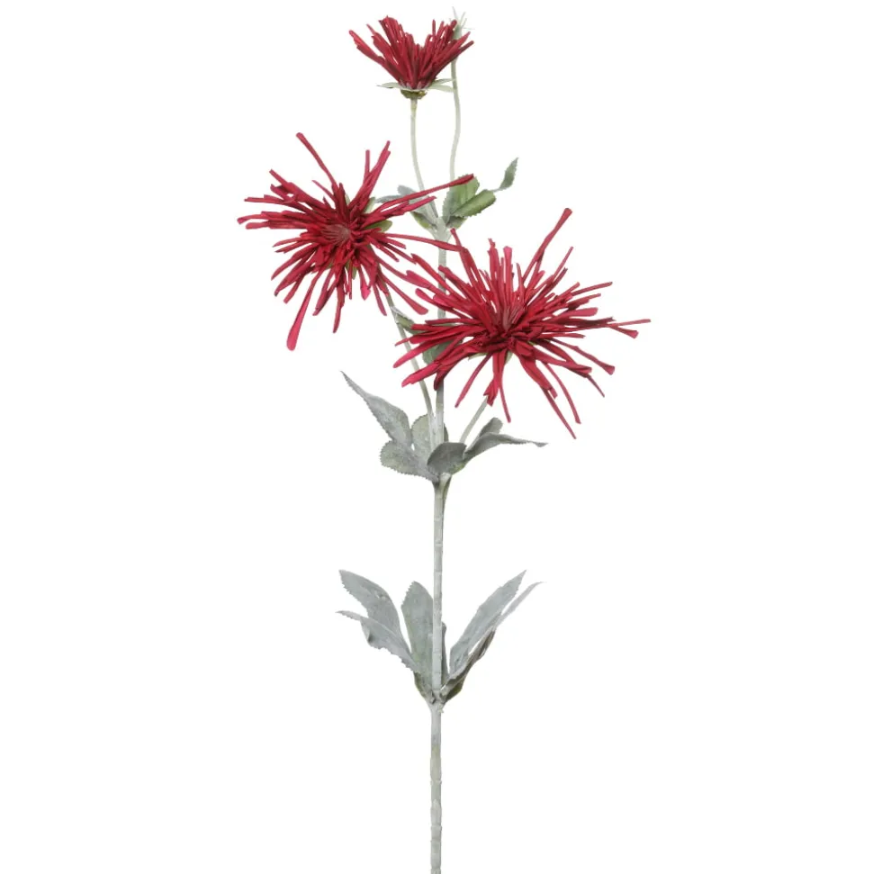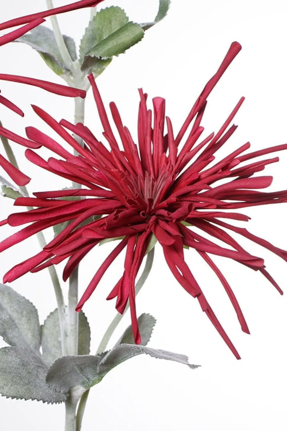 Artificial flower, red chrysanthemum, 32". Considered a perennial, the Chrysanthemum flower is a colorful one, perfect for a fall or winter bouquet. Choose between 5 to 6 stems to form an arrangement in a standing pot!