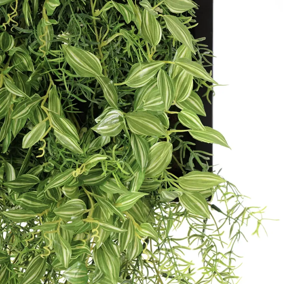 Artificial green cascade plant wall, 18 x 18″. Transform your space into a soothing retreat with this cascade of plants. The lively look and greenery evoke a sense of calm and well-being, ideal for creating a relaxing atmosphere. Comes in a black wooden frame. Handmade here by our artisans!