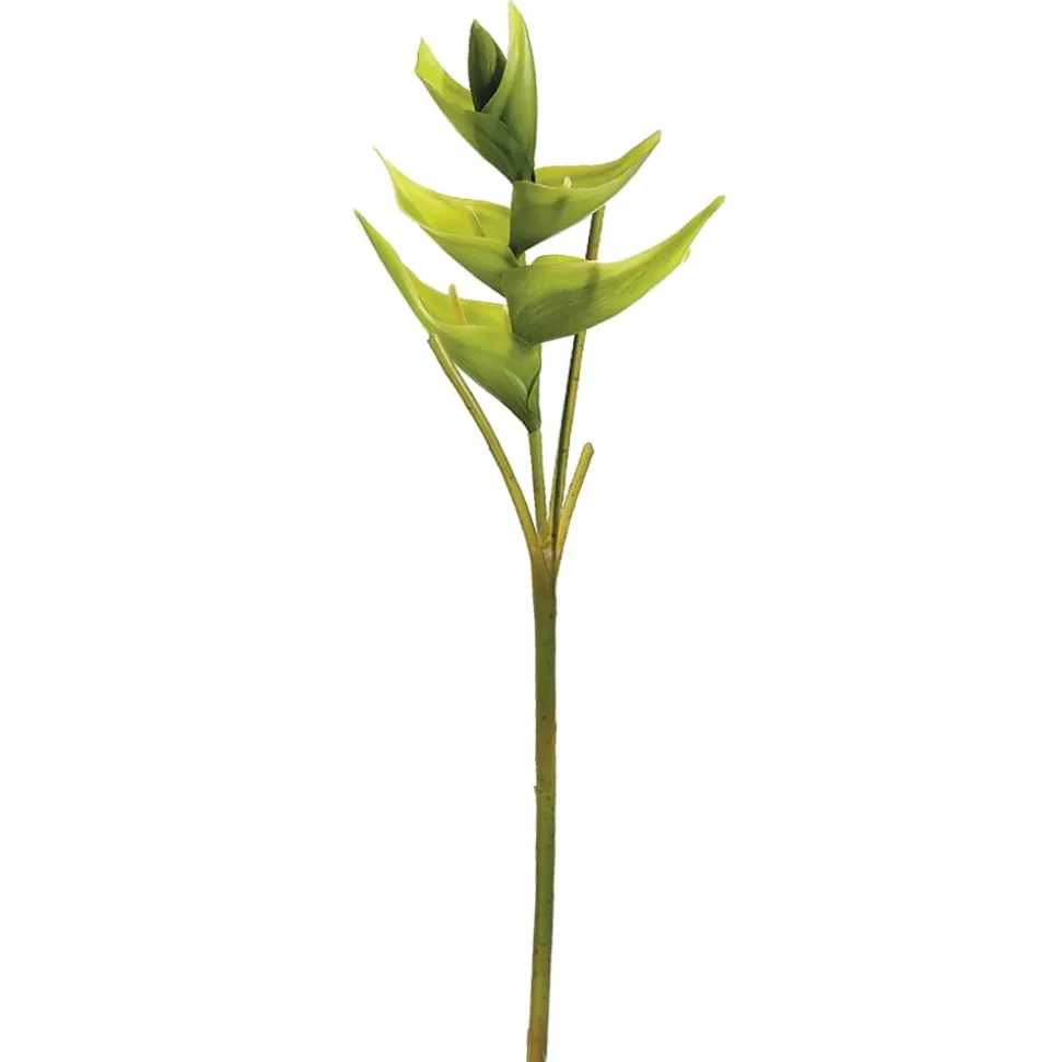 Artificial green heliconia flower, 34″. This type of faux flower can be used as the backdrop for a large tropical floral arrangement! You can combine it with other colorful flowers, as well as palm leaves.