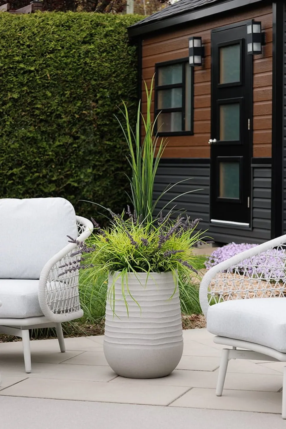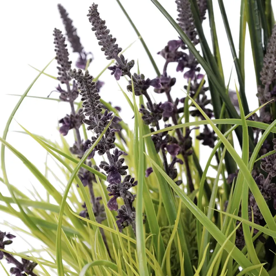 Artificial lavender and grass in a grey terrazzo beige pot, 55″. Get inspired by the whimscial landscapes of Provence with this artificial lavender planter! This model comes in the pot shown in the picture, into which a layer of rock was added to create weight to the arrangement. The plant was then set in urethane, and a final layer of mulch was added as the finishing touch.