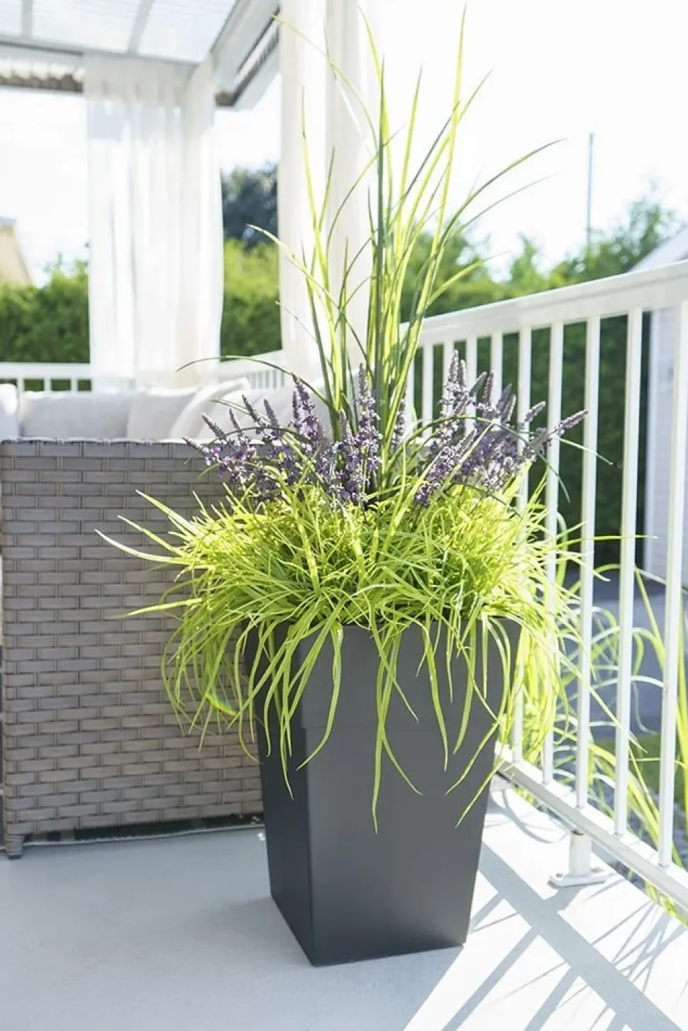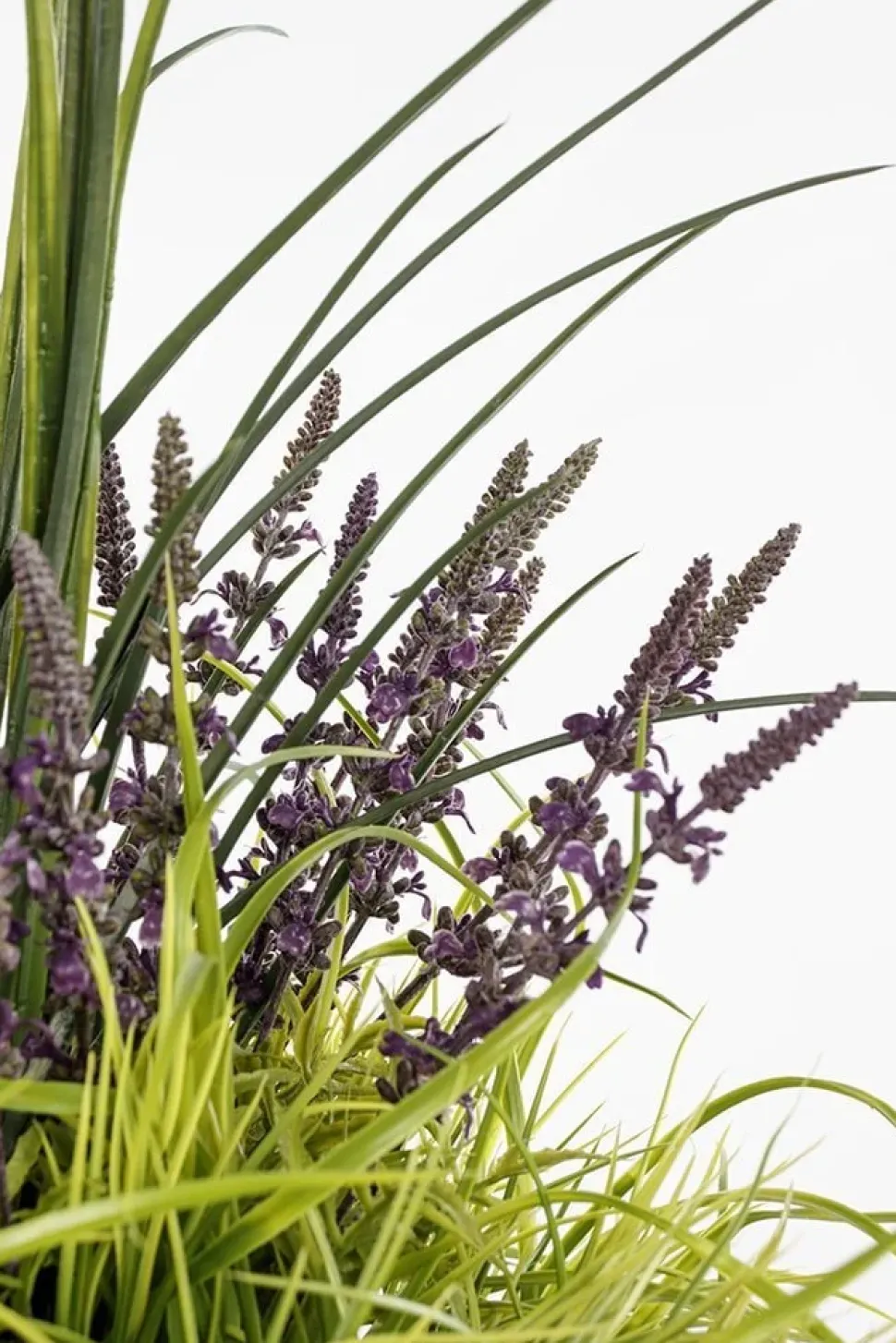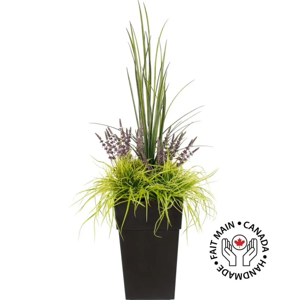 Artificial lavender outdoor floral arrangement, 50 x 16”. Transform your balcony or entryway into a peaceful area with this outdoor planter of greenery! This outdoor flower arrangement, set in a plastic pot, features realistic, maintenance-free faux purple flowers. With lush foliage and tall dracaena grasses, it will add a colorful touch to your outdoor space. Place this flower planter on your front steps for an inviting welcome every time you walk through the door of the house. This model comes in the pot shown in the picture, into which a layer of rock was added to create weight to the arrangement. The plant was then set in urethane, and a final layer of mulch was added as the finishing touch.