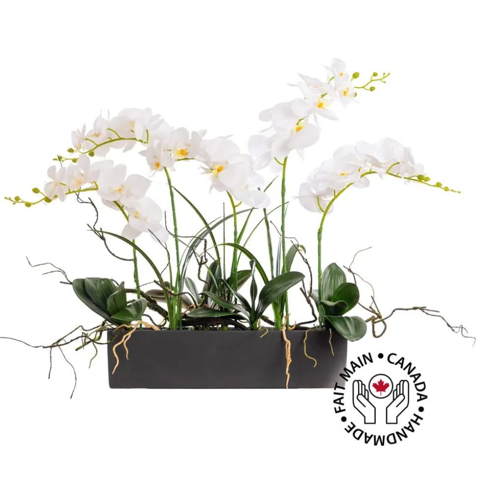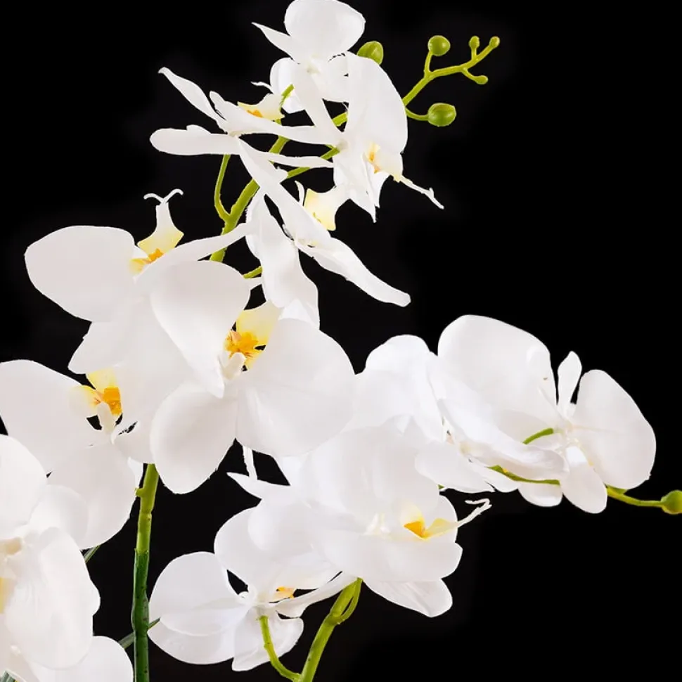 Artificial white orchid centerpiece. Each flower of this table floral centerpiece gracefully arches and sways, adding a sense of fluidity and movement to the arrangement. Unlike fresh flowers, which wilt and fade over time, this artificial arrangement requires no maintenance and retains its beauty indefinitely.