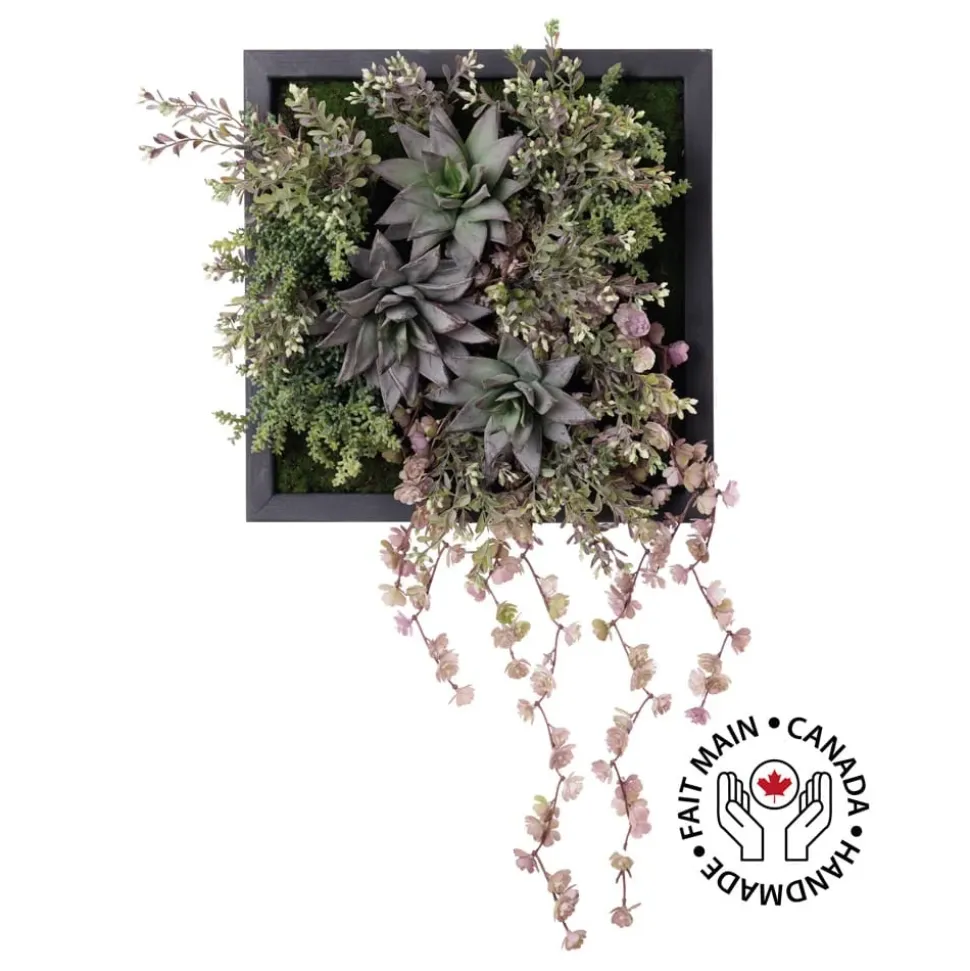 With shades ranging from green to purple, this artificial plant wall offers a colorful succulent drape that will brighten up any wall in the house! Plus, it doesn’t need special care. Its square shape suits most narrow spaces. Comes in a black wooden frame measuring 12 x 12″ handmade by our artisans!