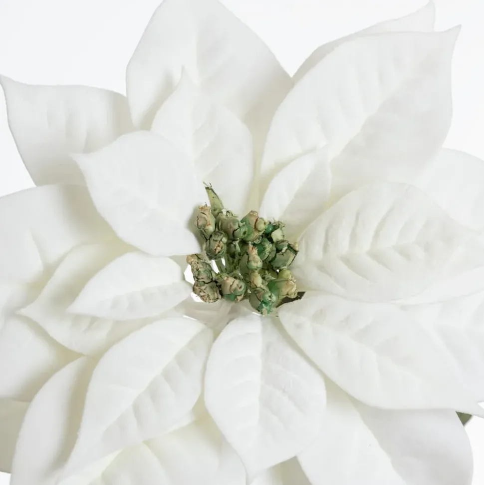 Artificial white Christmas poinsettia flower, 28″. Take your Christmas tree’s beauty to the next level with this gorgeous white flower. Its big size allows it to be used in spruce garlands, mantels and other holiday decorations for a fresh twist on the classic red look. Also available in another color.