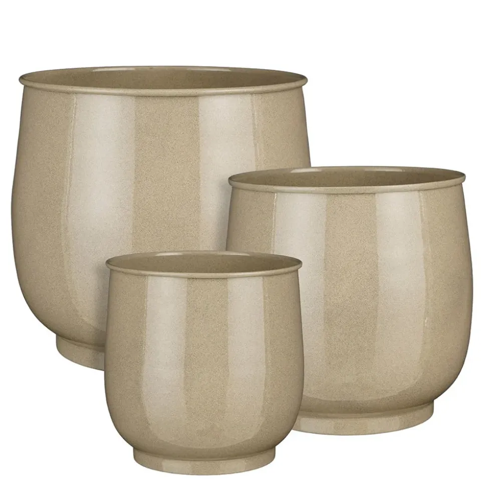 Beige round planter. With its glossy finish and beige color, this pot will be the piece you are looking for to recreate a Mediterranean-inspired space. All you need to do is combine it with a pink flowering plant or an artificial olive tree. For indoor use. 2 sizes available.