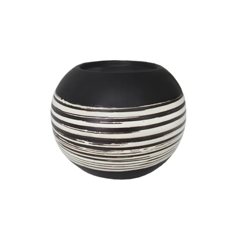 Bougeoir rond en céramique noire et blanche mesurant 5 x 5,5 x 5,5''. Agencez-le avec les différents modèles de vases et d'assiettes de la même collection!