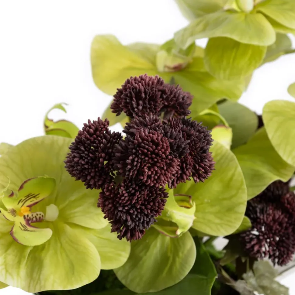 Burgundy sedum and green orchid centerpiece. Combining the softness of green orchids with the textured richness of burgundy sedum, this artificial floral arrangement brings balance and refinement to any space. The silver tray reflects the light, enhancing the composition.