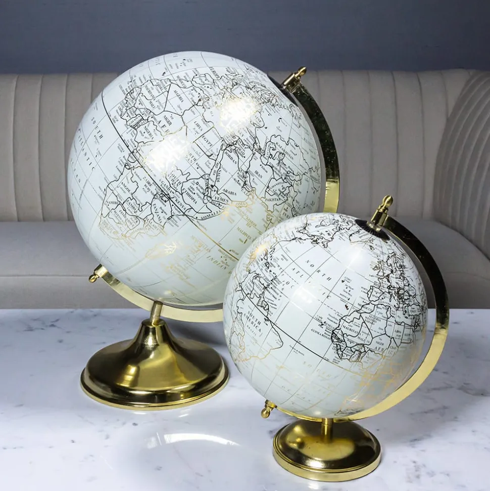 Cream earth globe on a gold stand, 12″ in diameter. This large globe on a stand is a timeless piece in residentail and commercial offices. This cream home accent with gold writing, and cartography lines is a great decorative element and a useful tool for organizing your next trip. Other similar models also available from this collection.