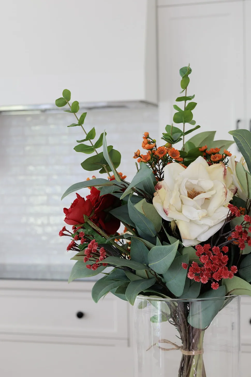 Artificial cream open rose, dried finish, 22''. Mix stems of this flower with foliage and other roses in fall tones. Also available in purple.