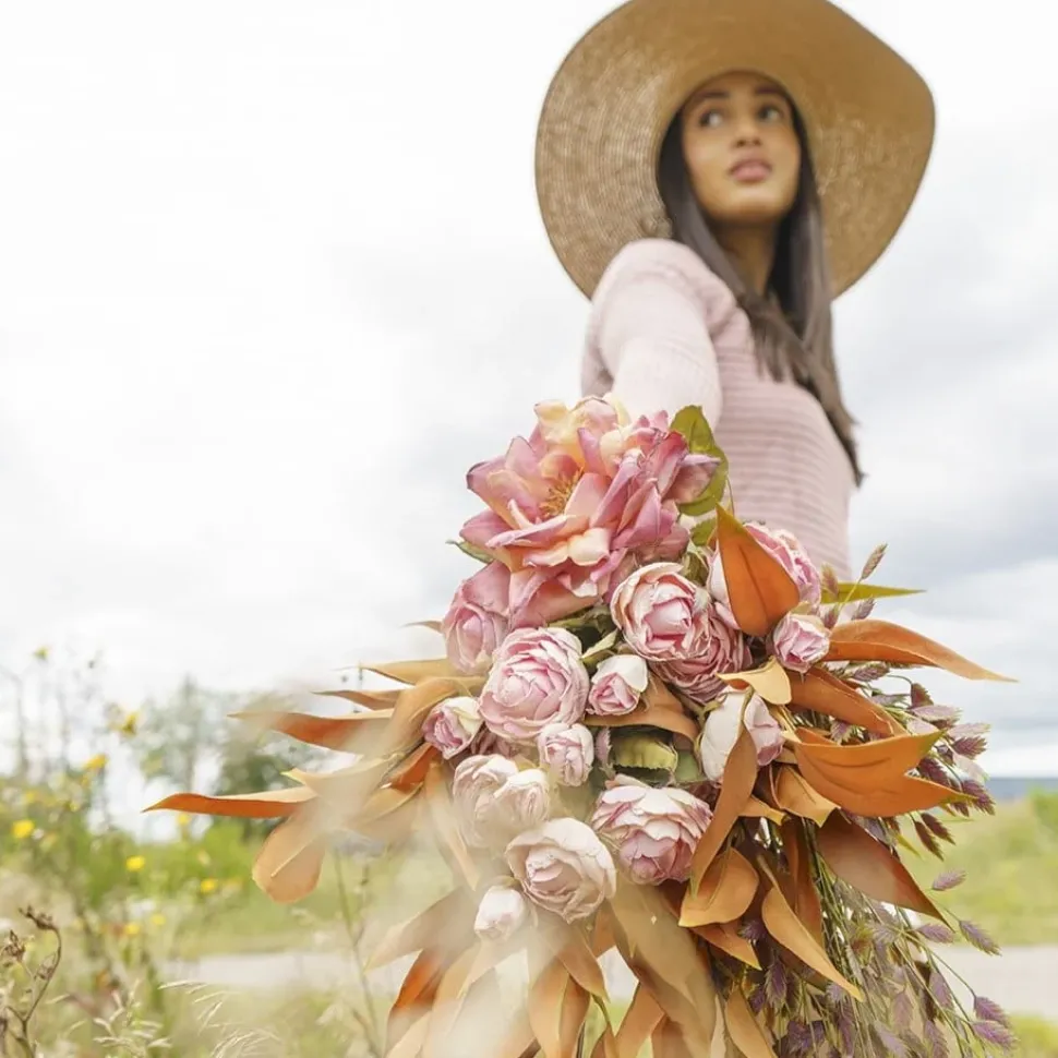 Purple open rose, dried finish, 22''. Make your own fall floral arrangement with this purplish rose! Also available in cream color.
