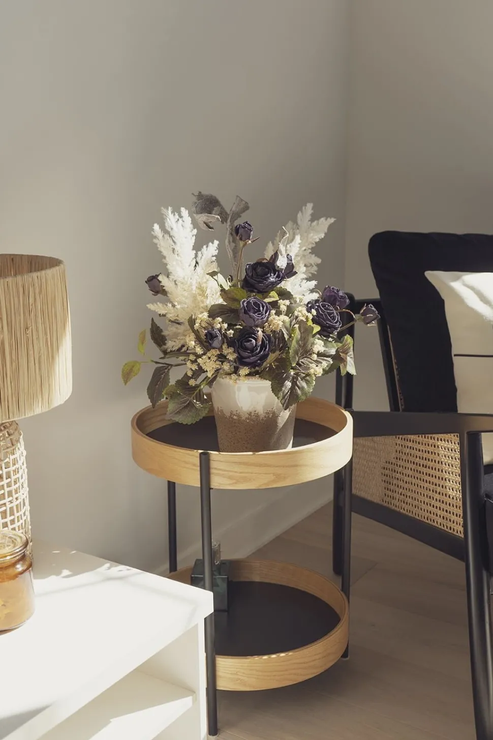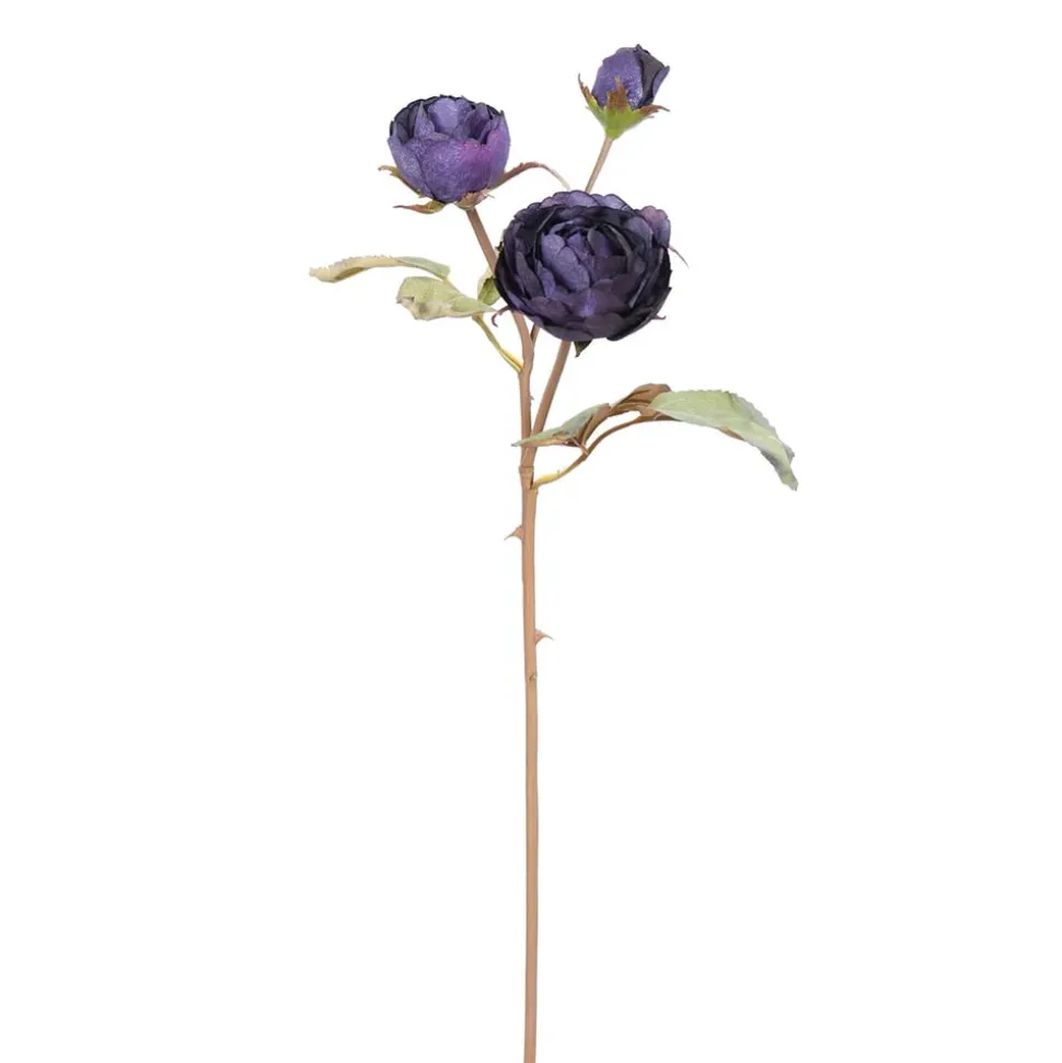 Artificial plum open rose, dried finish, 20.5". Add character to any floral arrangement with this blooming rose indicating the end of the season. Also available in purple and white.