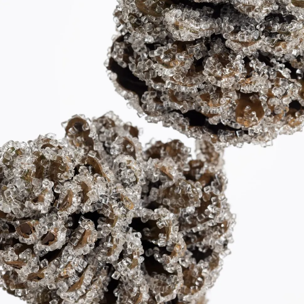 Frosted pinecone double branch, 28″. Discover this duo of frosted pinecones, a winter decor piece that evokes the splendor of the cold season. The pinecones are delicately covered with sparkling frost, creating an authentic, natural ice effect.