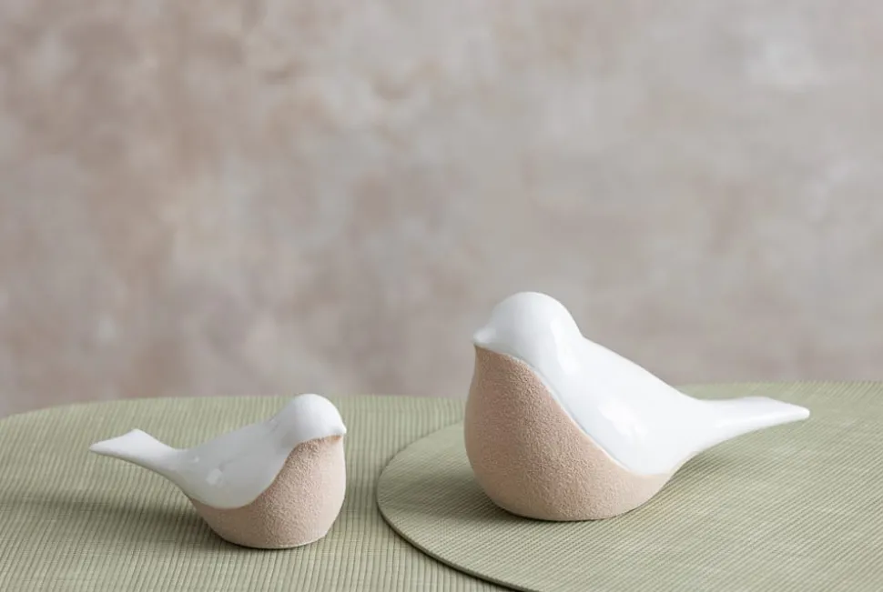 Glazed porcelain bird figurine, 6,5″ . Add some minimalist style to your spring decor with this elegant neutral porcelain bird. The flowing lines and artfully simple design of this graceful bird figurine is accented by its matte natural-coloured body and its shiny white coat for an elevated complement to any space. Other size also available.