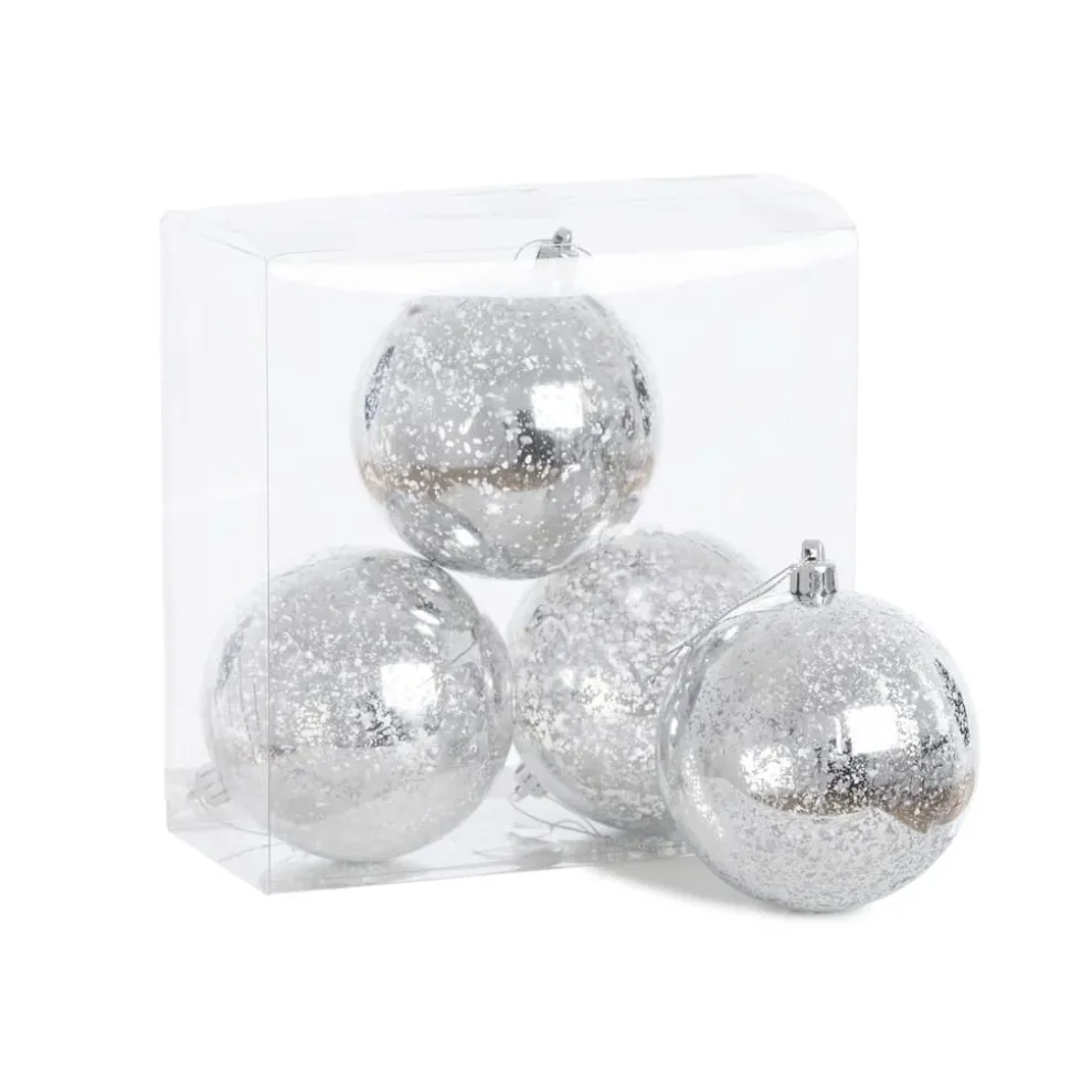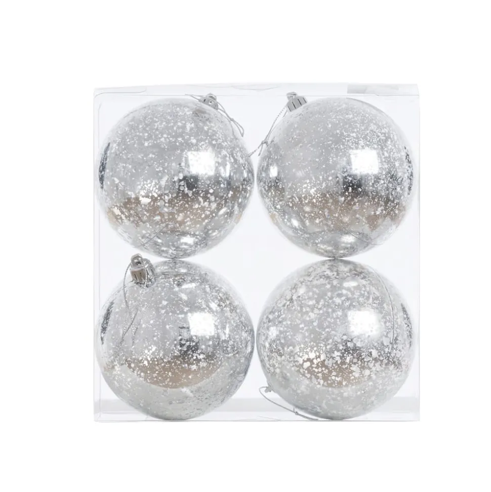 Box of 4 glossy silver mercury Christmas ornaments, 4″. For a modern Christmas tree decoration, opt for these silver ornaments! With their glossy mercury finish, your tree will look chic as can be. Pair with white baubles.