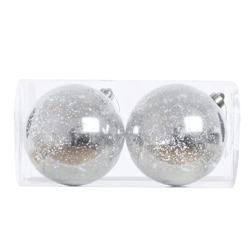Box of 2 glossy silver mercury Christmas ornaments, 5,5″. Metallic tones blend well with white baubles for a look different from the traditional green and red Christmas tree.