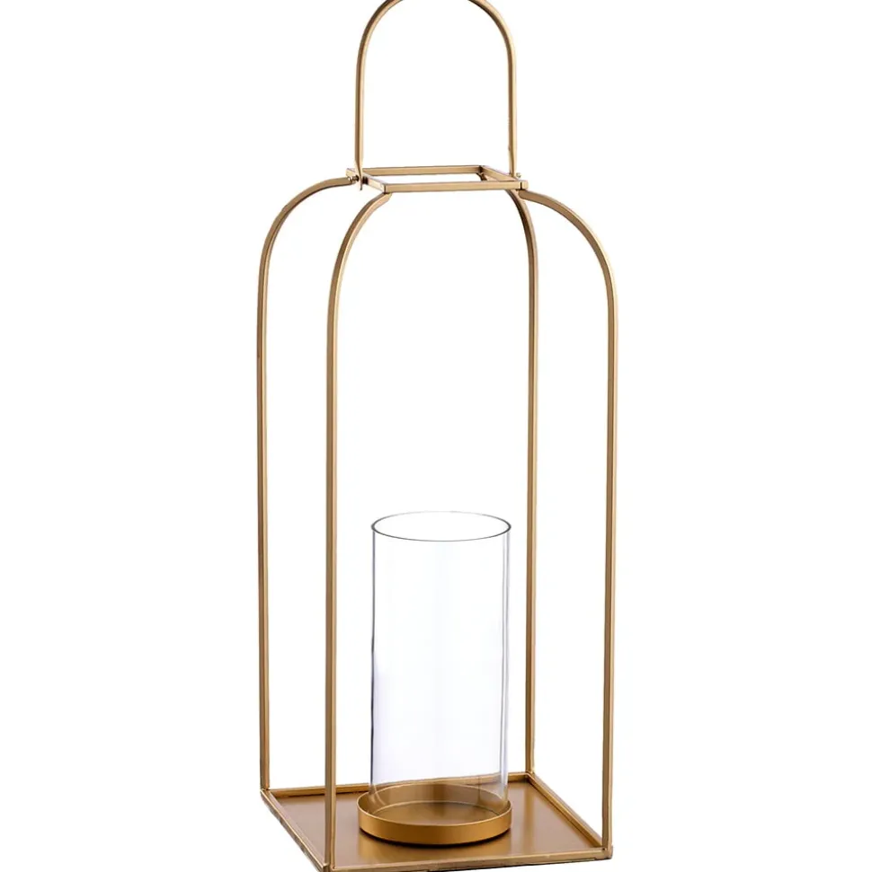 Tall lantern to match any interior, with its minimalist, golden details. Perfect for brightening up darker evenings. Also available in a smaller size.