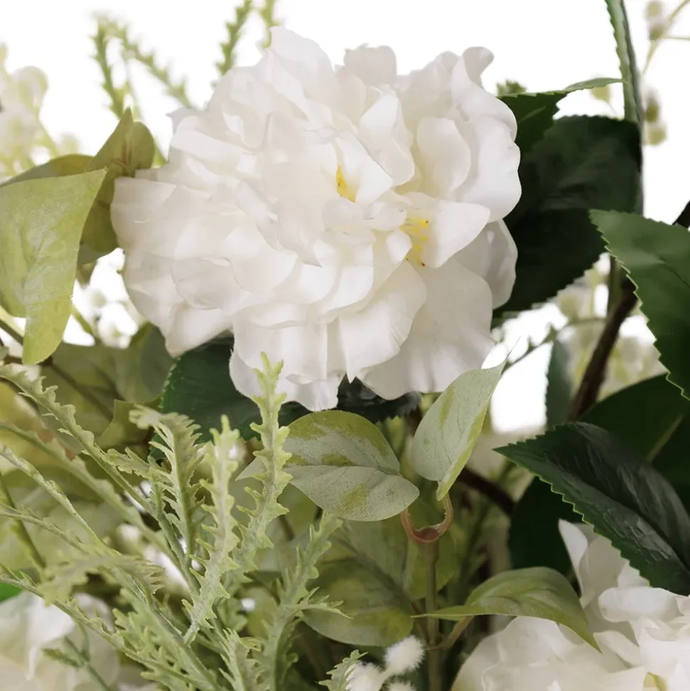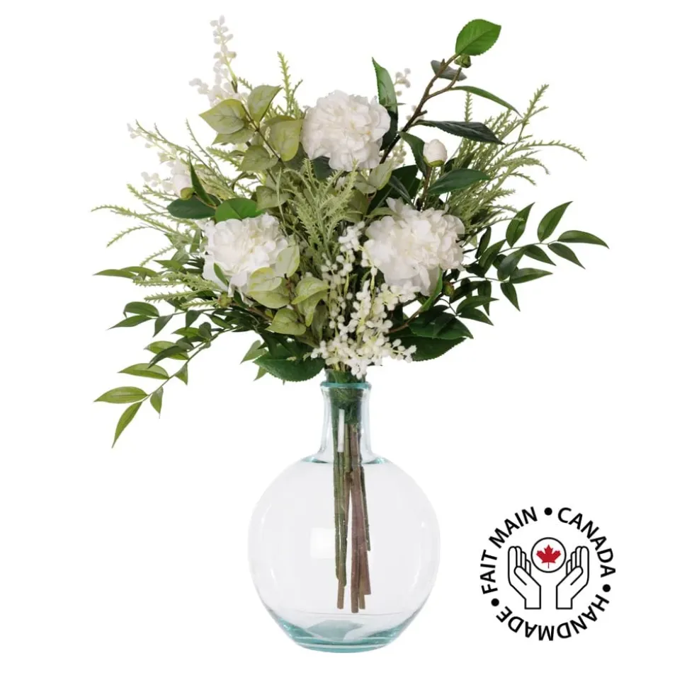 Celebrate the freshness of nature all year round with our artificial floral arrangement, elegantly blending pure white and lush green. An everlasting floral arrangement created with the ideal balance of natural elegance and functionality! This flower bouquet, presented in a glass vase that allows light to pass through, is ready to become the center of attention in your room.