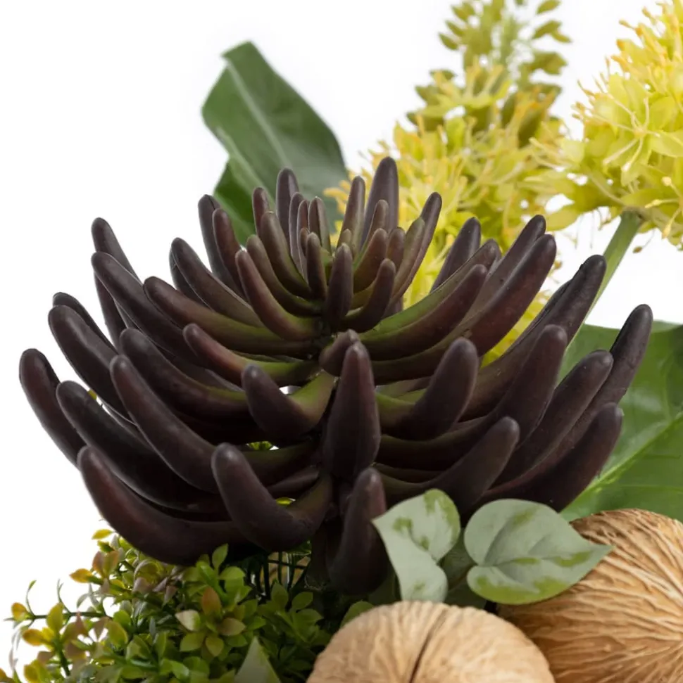 Artificial green eremurus tropical centerpiece. Elevate your decor with this tropical green eremurus centerpiece, a bold floral piece that combines height, texture and elegance. Perfect for a spacious kitchen island or large dining table. Comes in a gold tray.