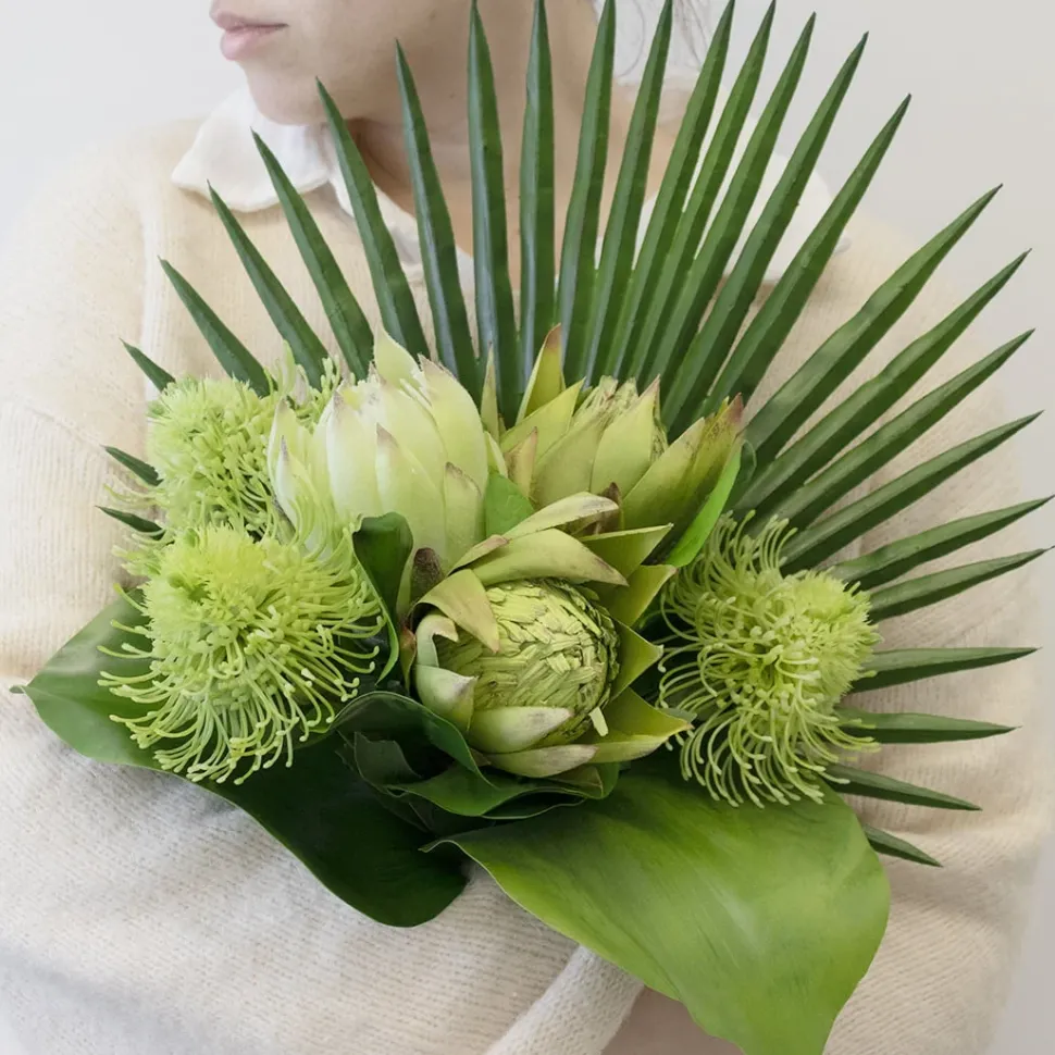 Green King Protea, 22''. This flower will add a subtle exotic touch to your bouquets. Also available in white.