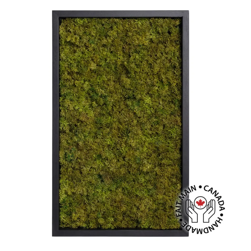 Véronneau creation. Green moss artificial plant wall, 24 x 15″. Create an attractive wall decor with a green moss plant frame. You can leave it as it is or add succulents and greenery of your choice. This green wall is encased in a black. Since this is a handmade arrangement, the shape of it may vary slightly. Also, please note that not all of our arrangements are necessarily available in store, as they must first be made by our florists. To have it on the same day, it is best to call us before you come.
