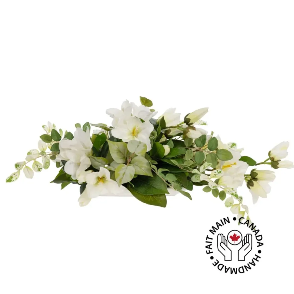 Bring a spring vibe to your table setting with this artificial arrangement of variegated foliage and white flowers! Since this is a handmade arrangement, the shape of it may vary slightly. Also, please note that not all of our arrangements are necessarily available in store, as they must first be made by our florists. To have it on the same day, it is best to call us before you come.