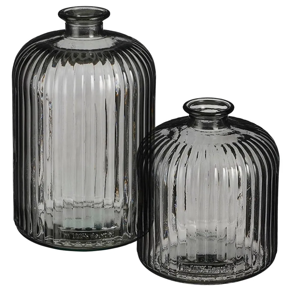 Grey ribbed recycled glass flower vase. Whether you use it to hold bouquets of artificial flowers, dried eucalyptus branches or simply to sit majestically empty, this vase is a trend-setter! Combining timeless elegance with environmental awareness, this vase is much more than a simple decorative object.