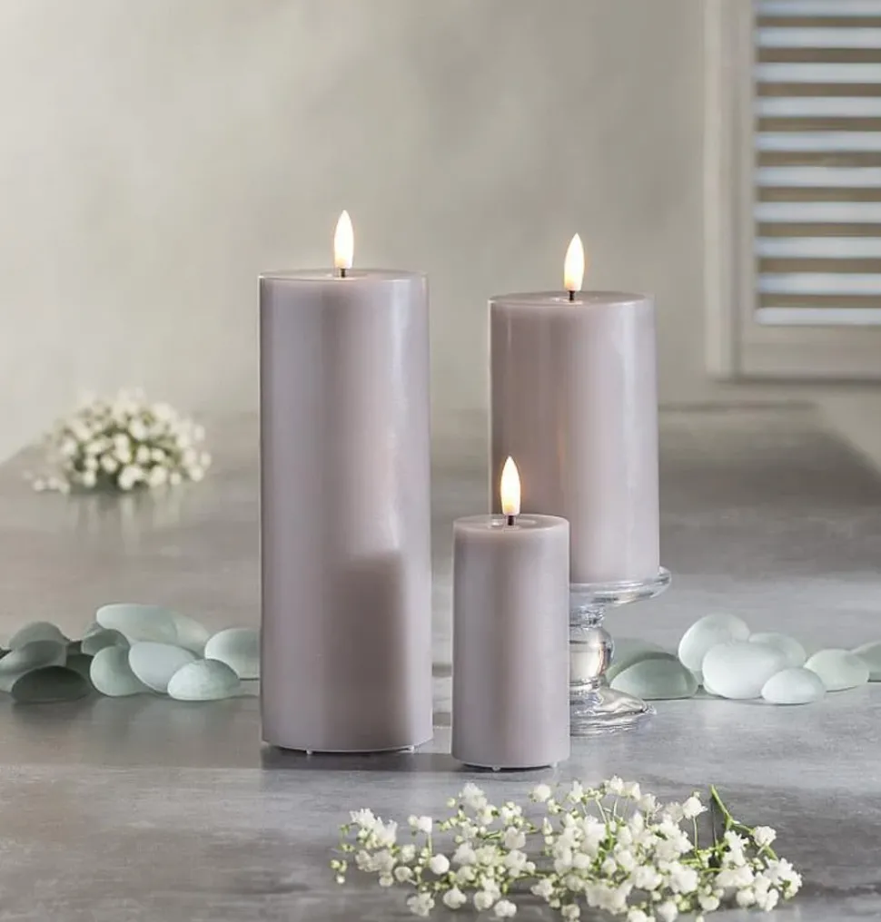 Enjoy the warm glow of flameless candles with in complete peace of mind, thanks to this elegant small grey warm white LED candle. Designed in Sweden, this all-wax candle features a realistic 3D LED flame, with a burn time of over 150 hours. Features an 8-hour timer. Powered by 2 AA batteries (not included), this candle discreetly complements any decor, alone or in combination with other LED candles.