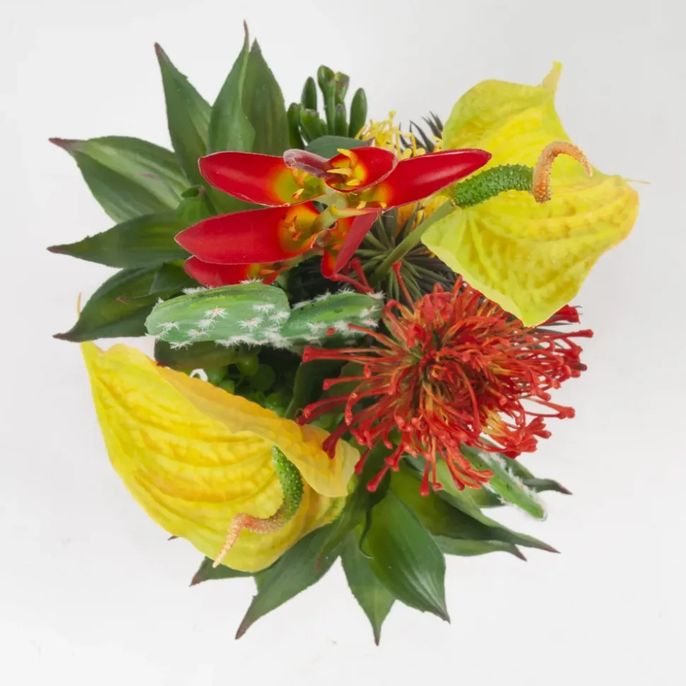 Heliconia Psittacorum Stem, 28''. This is stem is the perfect exotic addition to your bouquets. Its flowers blend particularly weel with Proteas and oversized foliage.