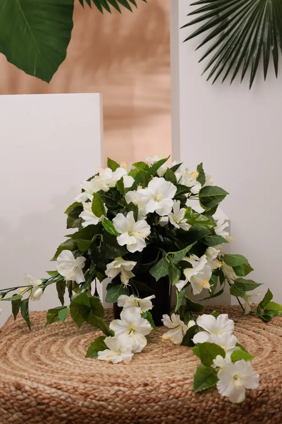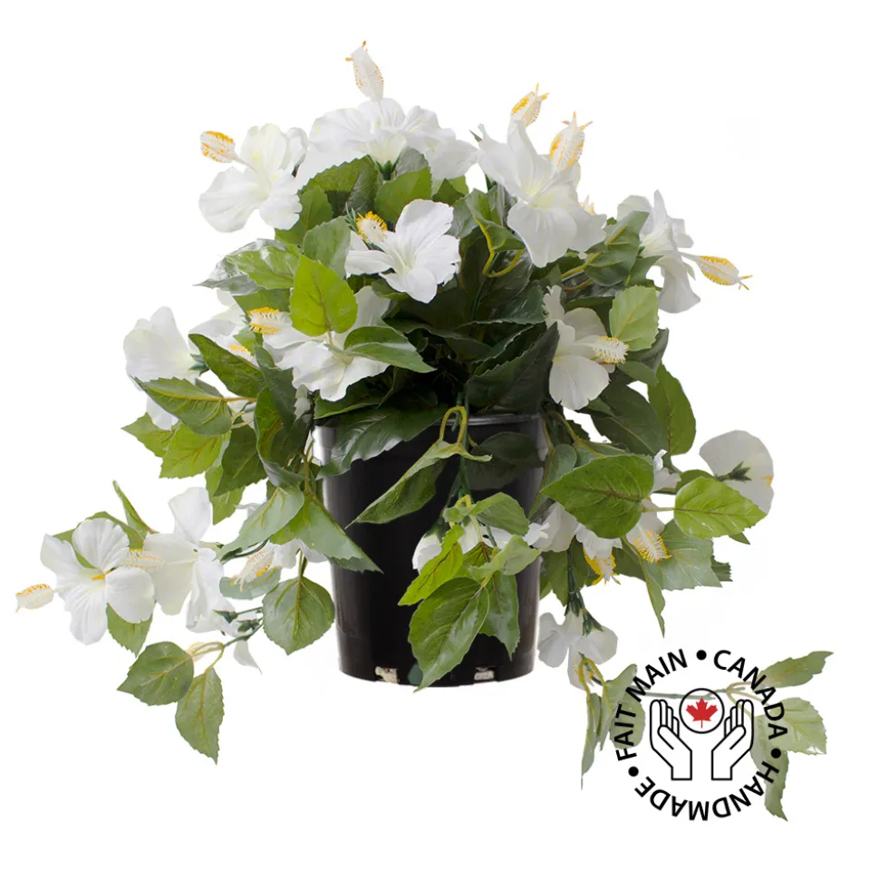 Hibiscus blanc en pot de culture noir, 22 x 12″. Égayez votre terrasse extérieure en un instant avec cet hibiscus artificiel aux fleurs tropicales! Produit conçu pour l’extérieur traité contre la décoloration causée par les rayons UV. Déposez-le dans votre cache-pot préféré et le tour est joué.