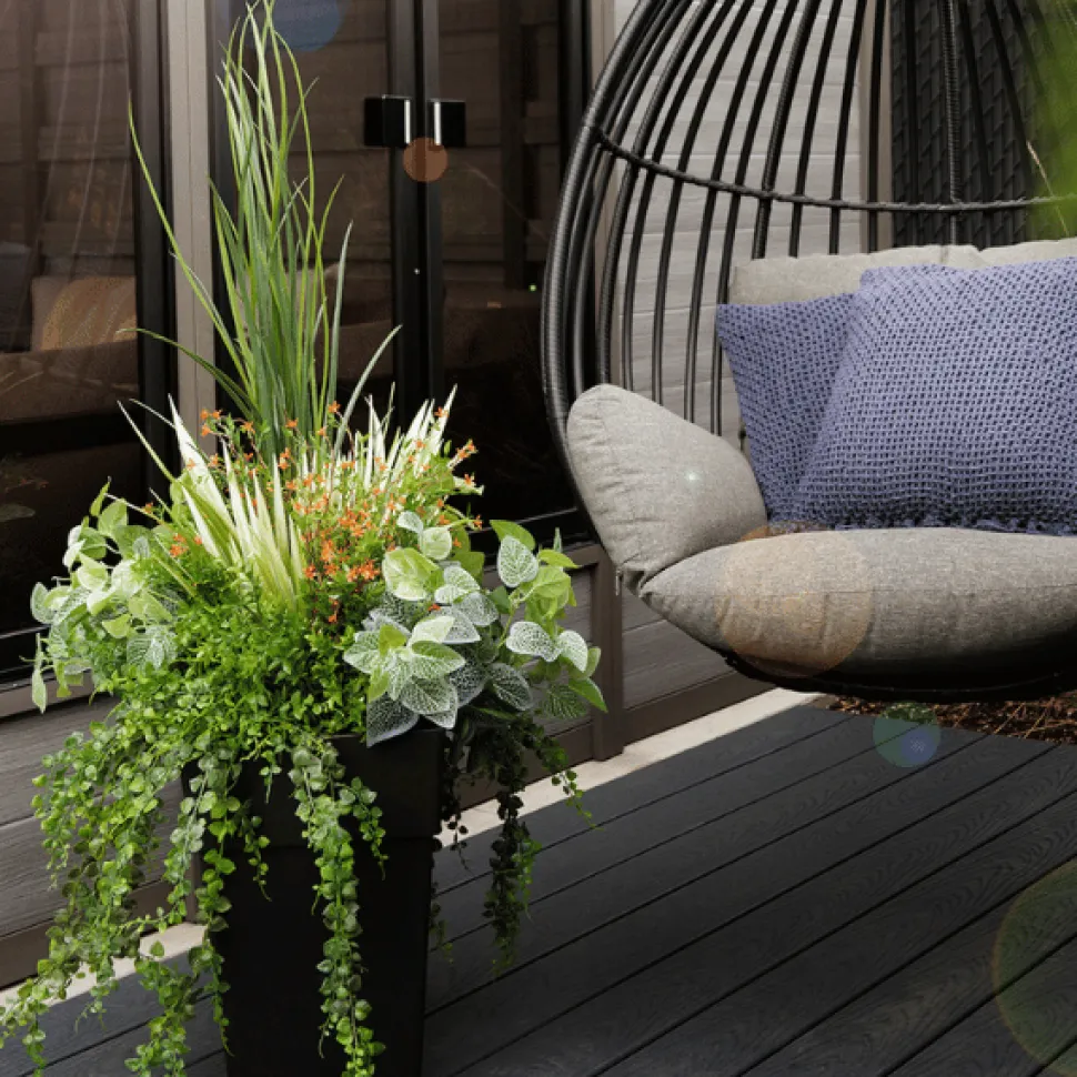 Jardinière extérieure de fleurs orange et plantes artificielles. Pour ajouter un peu de couleur tout en délicatesse, optez pour cette jardinière de verdure et petites fleurs orangées! Pour préserver la couleur de votre plante encore plus longtemps, vaporisez un protecteur UV pour plantes artificielles à chaque début de saison.