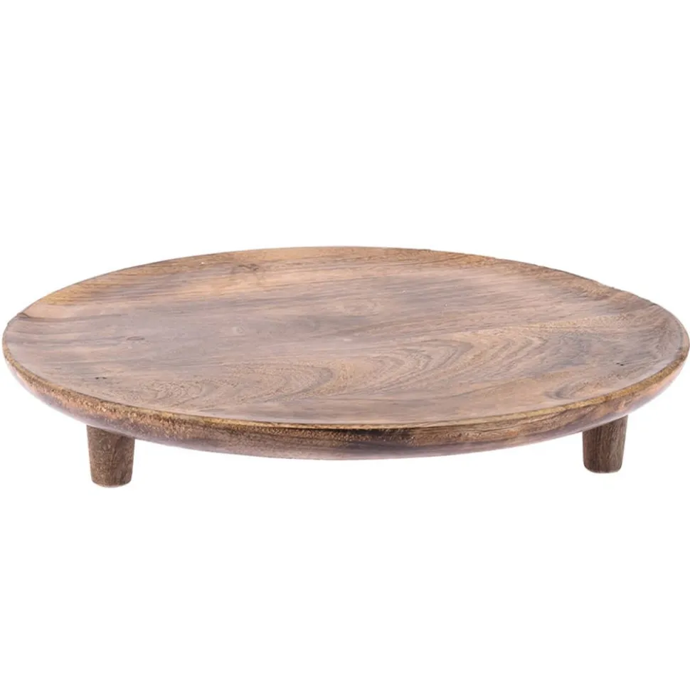 Mango wood round plate on a stand, 14,5″. Make a lovely display for your candles, flower vases and small books! Another size is also available.