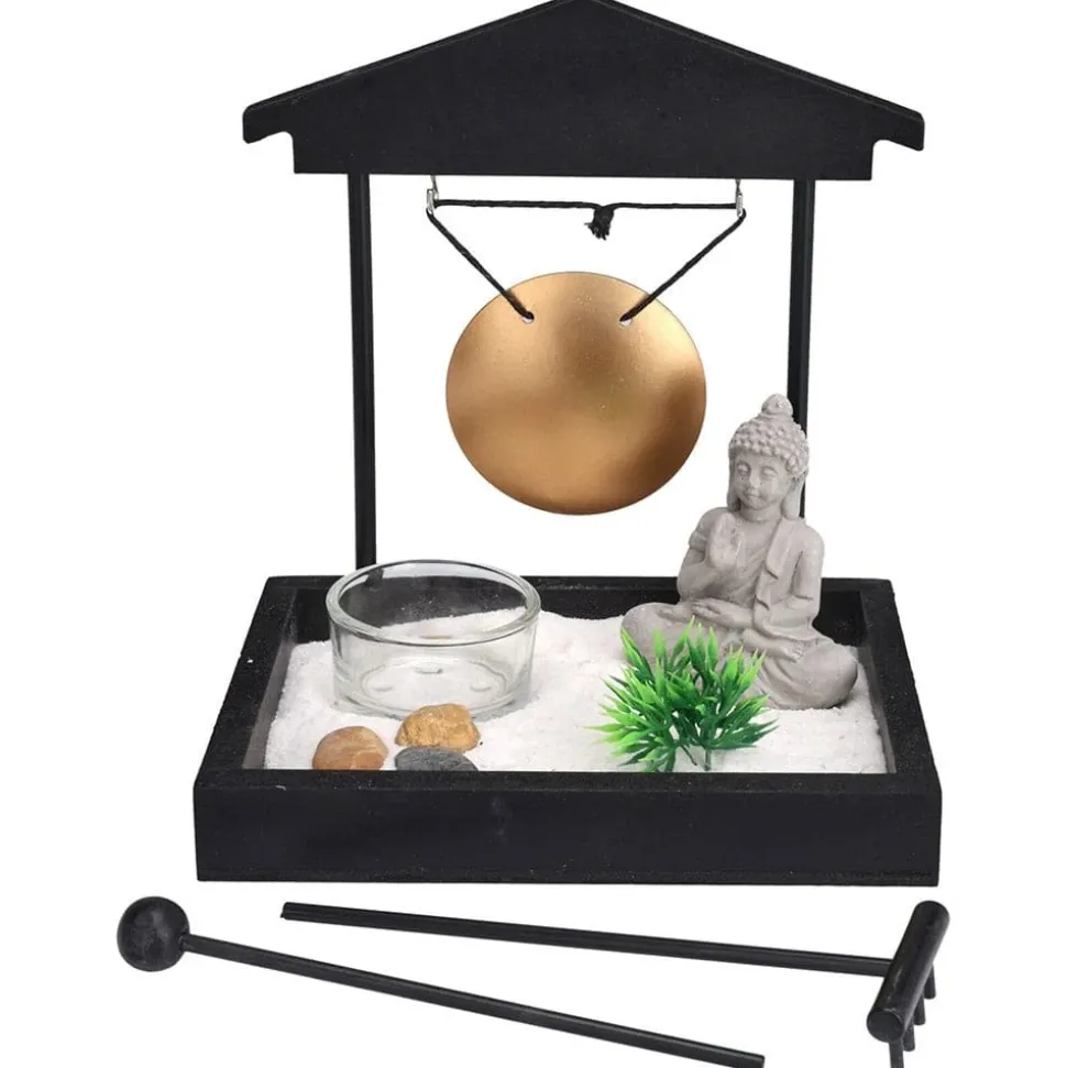 Mini buddha zen garden set, 6,5 x 6″. Have fun assembling this mini Zen garden to create your own meditation space! All that’s left to do is sit back, relax and meditate. Includes: base, gong, wooden drum stick, plant, clay Buddha, sand, 2 decorative pebbles, candle holder and mini rake.