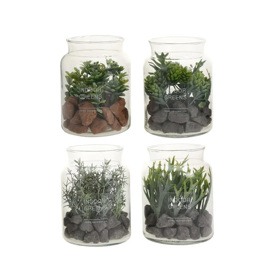 Mini glass terrarium of succulent plants, 6 x 5''. Small artificial terrariums are original decorative accessories for home offices or children's rooms! Let them contemplate their everlasting little plant. Includes decorative rocks, artificial plants and glass terrarium. Choose between 4 models, price per unit.