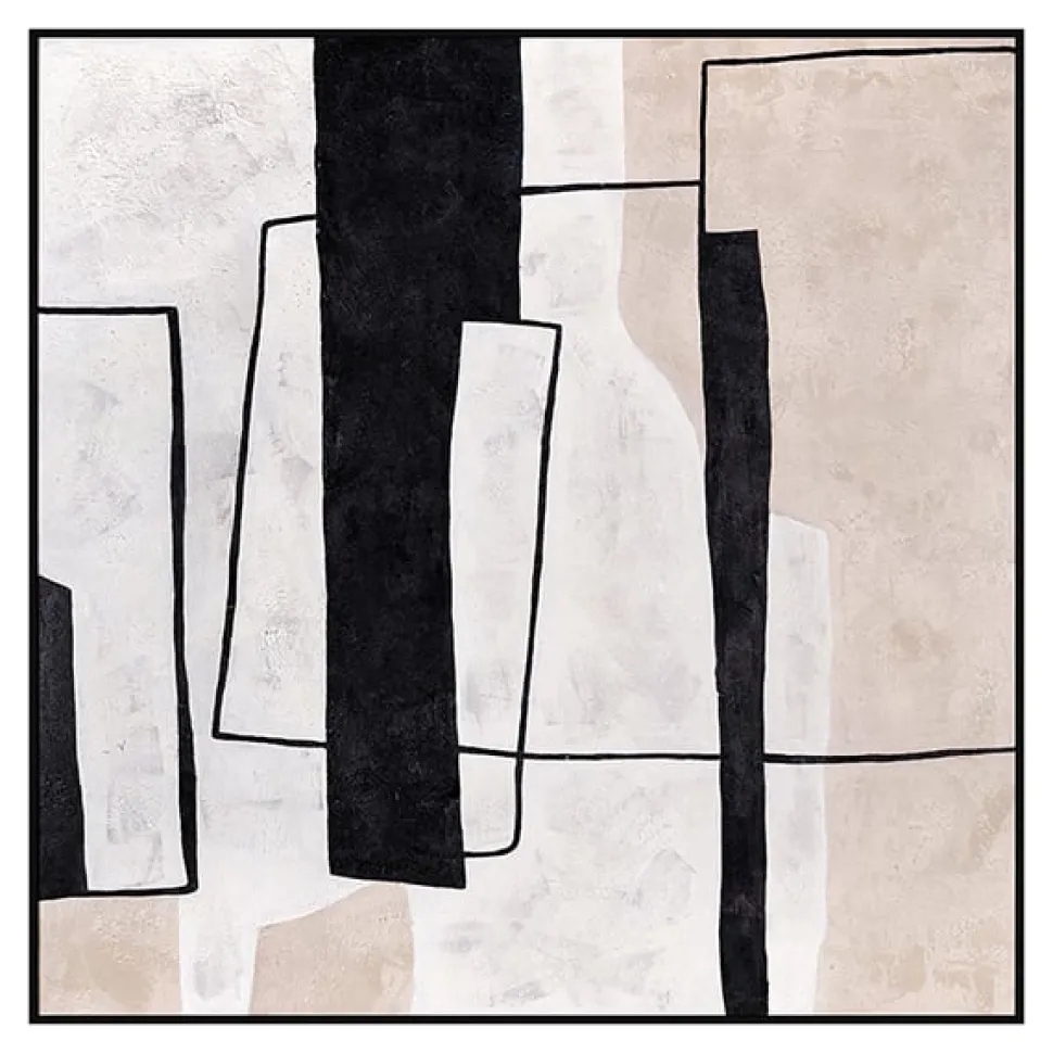 Minimalist black and beige wall art, 32 x 32''. The canvas is an essential home accent to add the finishing touch to an interior space! This abstract design is no exception to the rule. Note that this is a printed painting on canvas with painted details. Comes with black MDF frame.