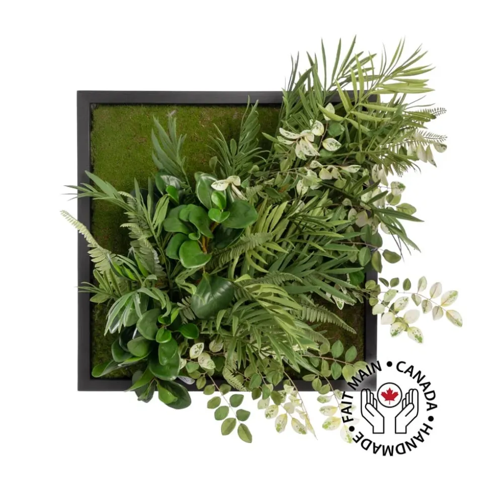 Mixed greenery and moss plant frame, 18 x 18″. For a modern and green space, try this artificial plant wall! Handcrafted with a variety of greenery, it promises to provide the most inviting decor. Comes with a black wooden frame. Please note that not all of our arrangements are available in store, as they must first be made by our florists. If you need them the same day, it is better to call us before coming. Also, since this is a handmade arrangement, the shape of it may vary slightly.
