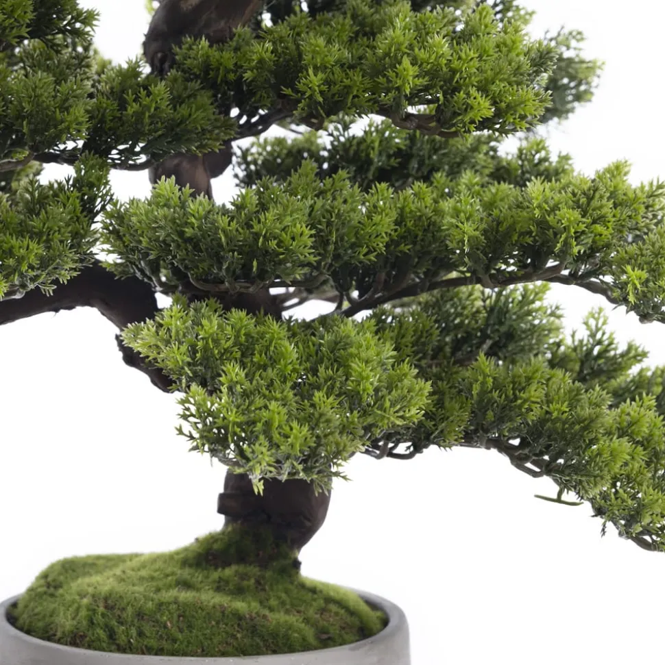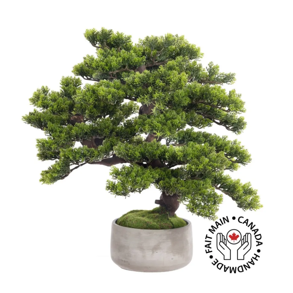 Véronneau creation. Artificial mountain pine bonsai tree. Carefully made by the experienced craftsmen of our workshop, this premium quality faux bonsai tree offers a realistic foliage. Each bonsai is made from real recycled tree trunks. Support local, by getting a bonsai made here in Canada! Sent with its cement planter.