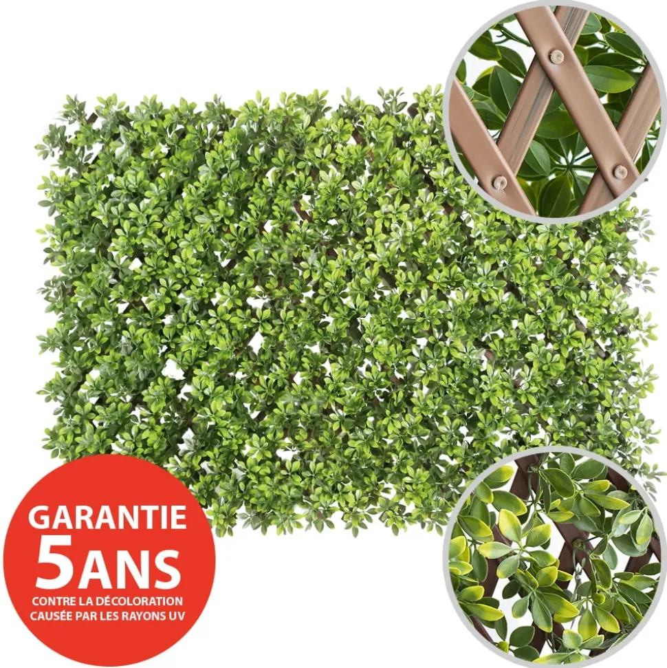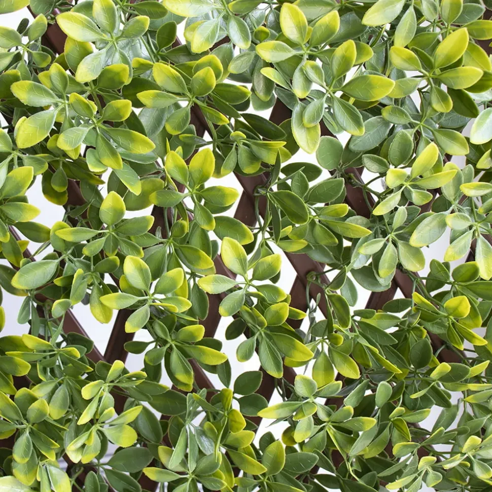 * Check out our new expandable trellis model! This one differs from our first model of trellis (green structure) by its dense artificial foliage, brown structure, lighter foliage and small leaves that look just like boxwood *