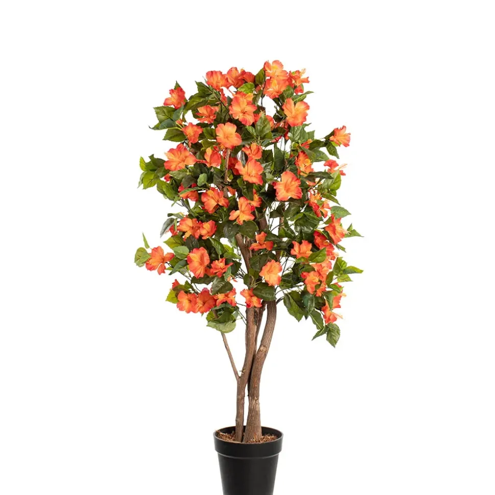 Exclusive Véronneau creation. This tree of orange hibiscus flowers – handcrafted by the artisans of Décors Véronneau – is truly unique. Find a space for it in your home, along with a trendy planter, and you’re done. This artificial tree is a great idea for a small backyard! It won’t take up much space, but it won’t go unnoticed in your garden. Place it under the gazebo or in the house for an instant punch of color with its orange flowers. The orange hibiscus flower tree is just what you need! Preserve its color by spraying it with UV protection at the beginning of each season.