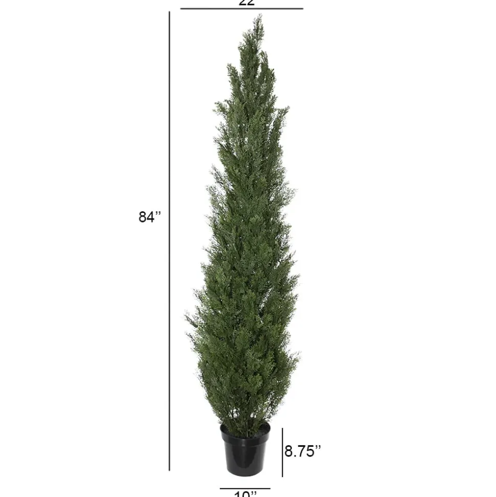Outdoor artificial cedar shrub in pot measuring 7 feet tall. Update your patio or yard space with artificial cedars that are even better than the real thing. Dress them up by placing in an outdoor pot that perfectly complements your decor! This artificial plant can be used for indoor or outdoor. It comes with a 2-year warranty against UV discoloration – no need to worry about it changing color! Other dimensions also available.