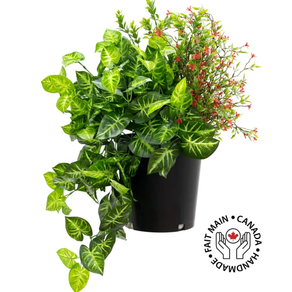 Outdoor potted red flower arrangement, 20 x 20″. Choose this stunning red flower display and enjoy effortless elegance with the best in artificial outdoor plants! Ideal for homeowners, landscapers, and anyone looking to enhance their outdoor environment with premium faux plants and flowers. This potted arrangement combines beauty with durability—without the hassle of watering or wilting. Designed for maximum impact, this UV-protected, low-maintenance piece brings vibrant color and life to your patio, garden, or balcony! All you need is a decorative planter.
