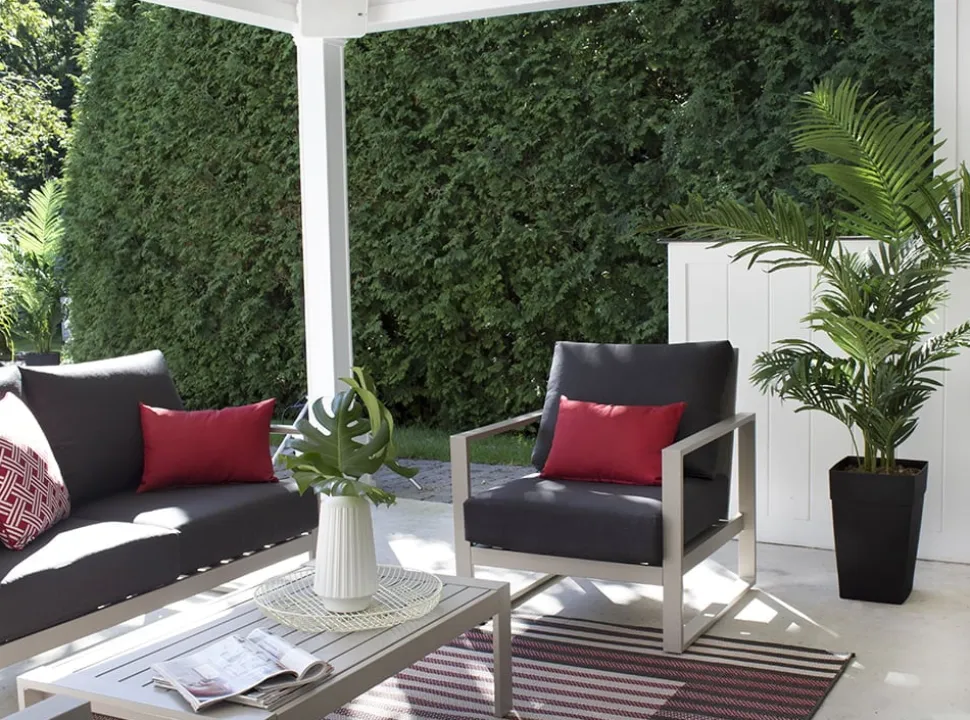 Quand vient le moment de décorer le jardin pour l’été, le palmier artificiel est un incontournable ! Ce faux palmier areca d’extérieur de 6 pieds de haut a tout l’air d’un vrai, vous ne ferez même pas la différence. Conçu spécialement pour l’extérieur, vous pourrez l’utiliser pour votre terrasse, autour de la piscine et même à l’entrée. Ce modèle vient dans le pot montré sur la photo, dans lequel une couche de roche a été ajoutée afin de créer du poids à l’arrangement. La plante a ensuite été fixée dans l’uréthane, puis une couche finale de paillis a été ajoutée en guise de finition. Si vous optez pour un faux palmier areca, alors vous n’aurez plus à vous soucier de l’arroser et de l’entretenir régulièrement. Avant de choisir entre un palmier areca ou kentia artificiel, sachez que ce dernier a un feuillage plus aéré et est plus imposant avec ses palmes. L’areca artificiel sera plutôt un palmier au feuillage dense! Vous obtiendrez donc un look un peu différent.