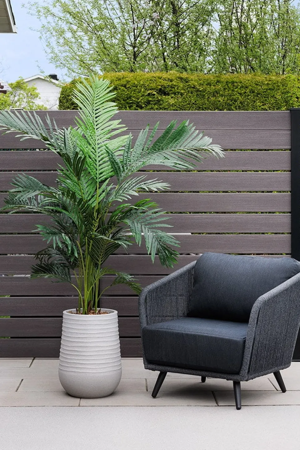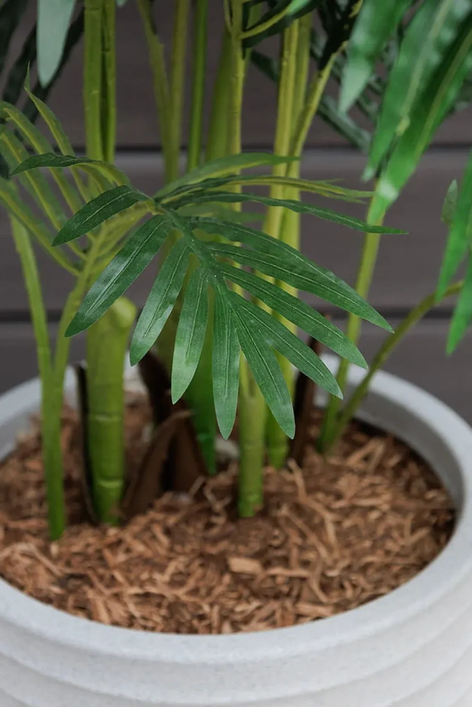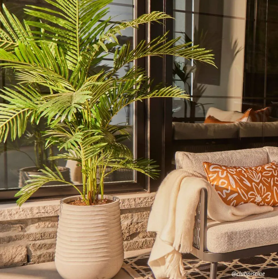 Palmier artificiel extérieur en pot beige fini terrazzo gris, 72″. Créez votre propre petit coin de paradis avec ce palmier artificiel pour l’extérieur déjà prêt à être installé là où vous le désirez! Ce modèle vient dans le pot montré sur la photo, dans lequel une couche de roche a été ajoutée afin de créer du poids à l’arrangement. La plante a ensuite été fixée dans l’uréthane, puis une couche finale de paillis a été ajoutée en guise de finition.