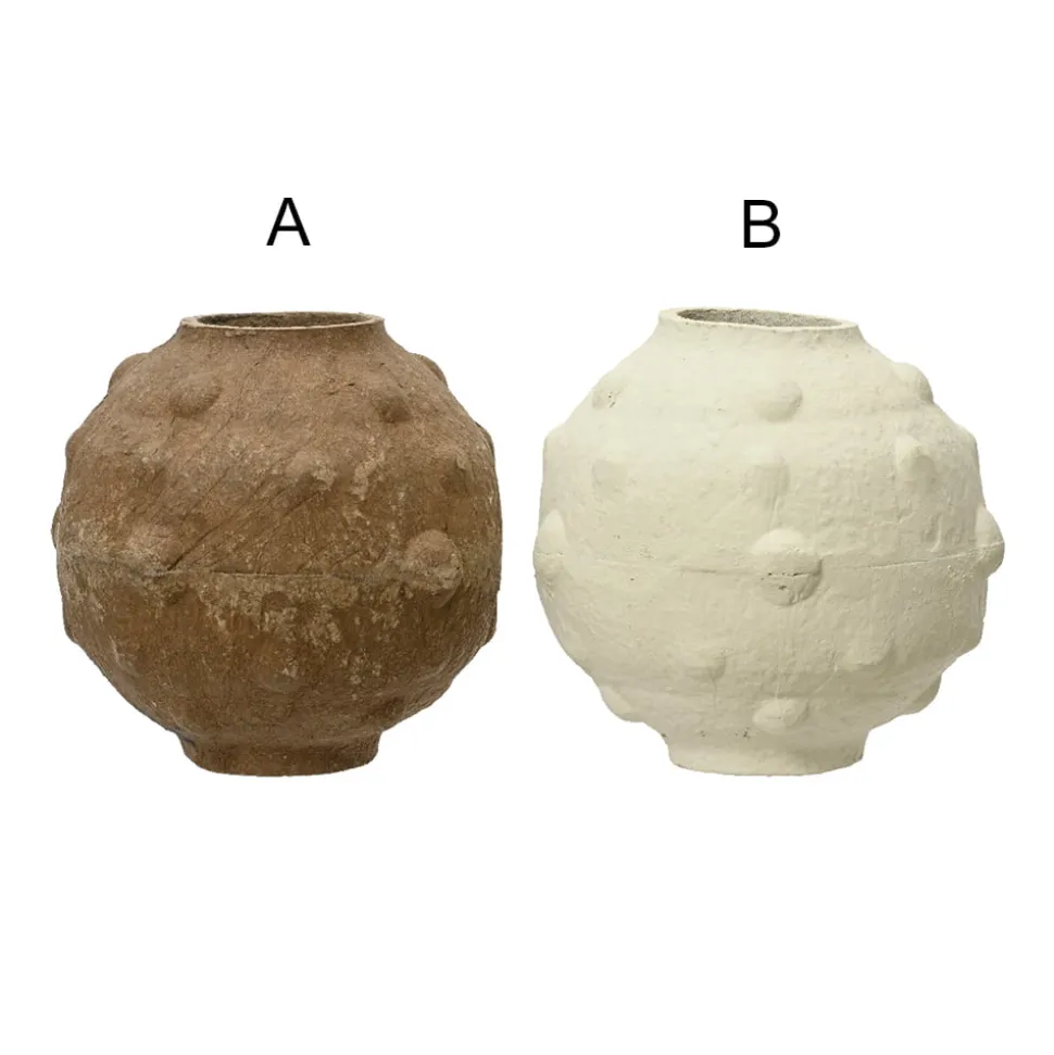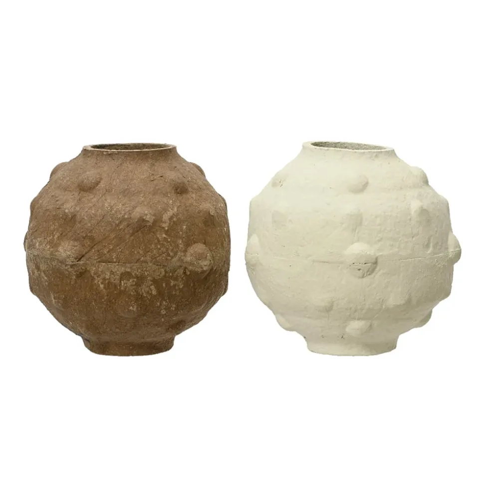 Laissez-vous charmer par les couleurs organiques de ce petit vase unique en papier mâché! De forme ronde avec un fini texturé, il sera magnifique tel quel ou avec de petites fleurs sauvages. Choisissez entre 2 couleurs (crème ou brun), prix unitaire.