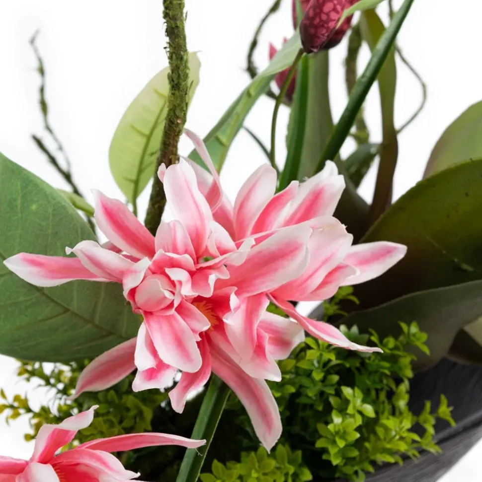 Artificial pink magnolia tropical arrangement. Escape to the heart of the tropics with this arrangement of lush greenery and vibrant pink flowers! It’s perfect as a centerpiece or on a console table.