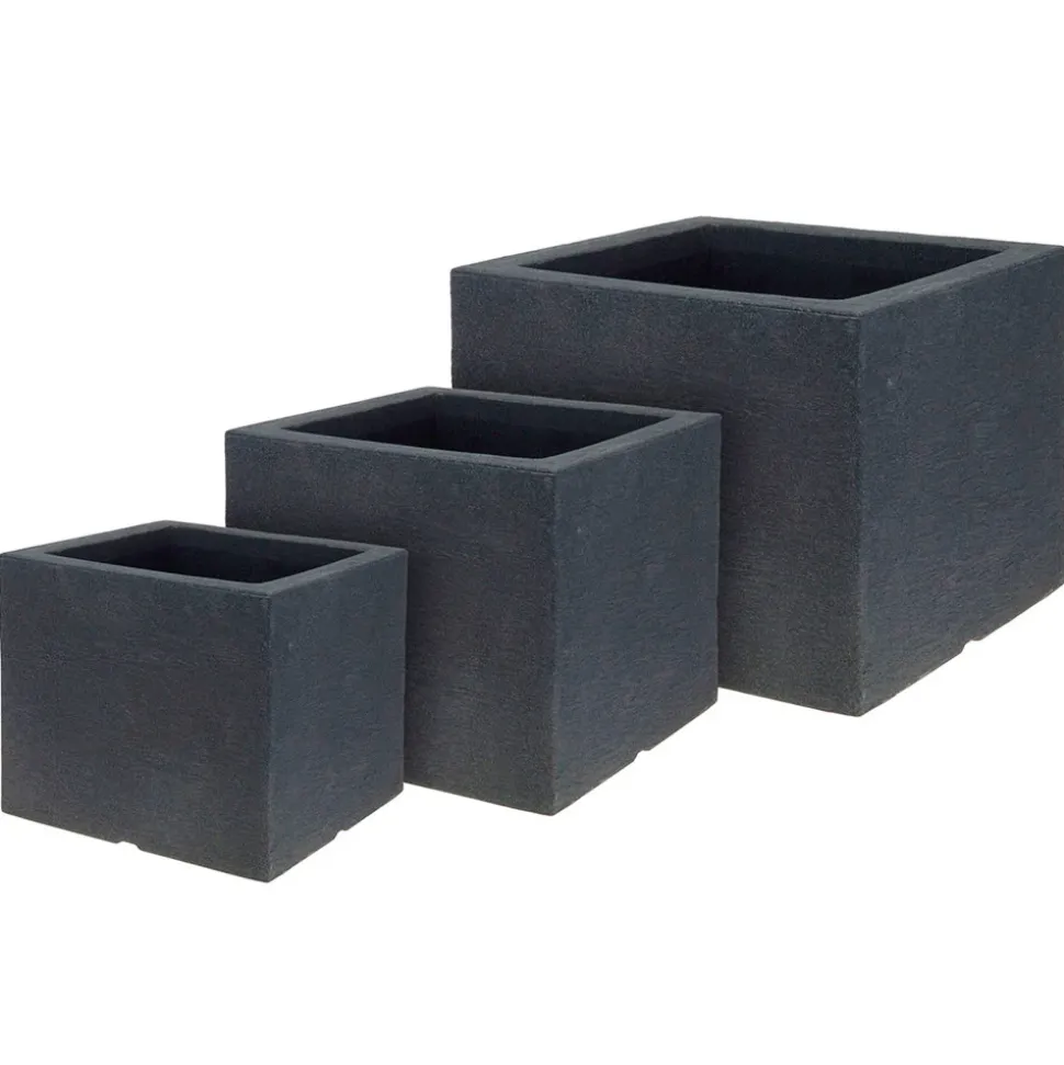 Dark grey square plastic flowerpot. This simple planter is perfect for floral arrangements with more color, without stealing the show! Made from polyethylene plastic, a durable, rigid material. You can use it in complete peace of mind on a sunny terrace.