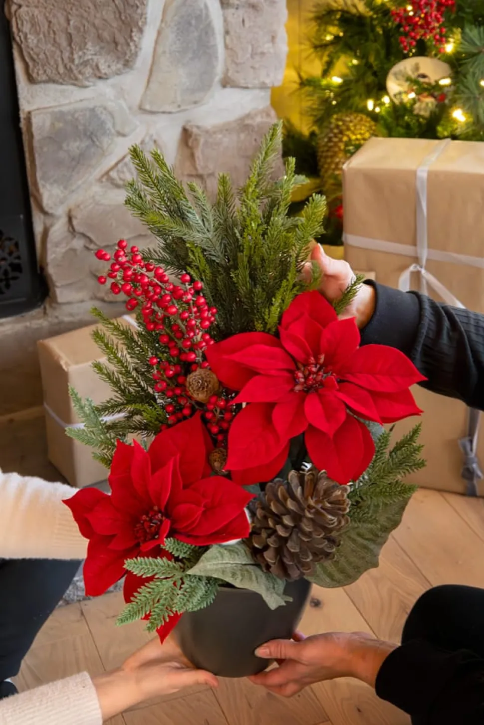 Véronneau creation. Looking for a unique Christmas or hostess gift? You’ll love this holiday floral creation, handmade by our florists! This Christmas arrangement is made from the finest artificial greenery. You’ll find pine, poinsettias and realistic red berries. Place it on a console table. Comes with a black pot.