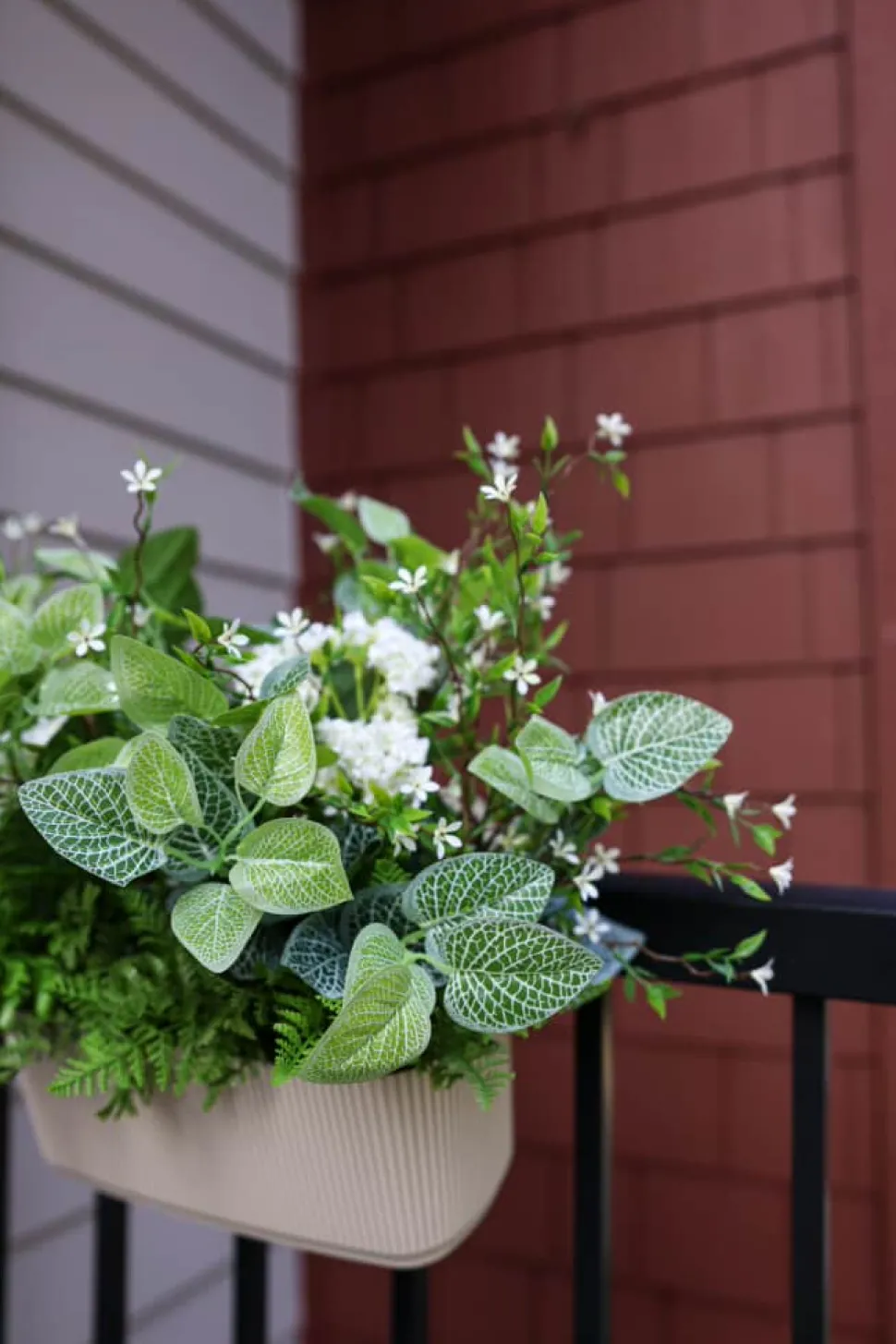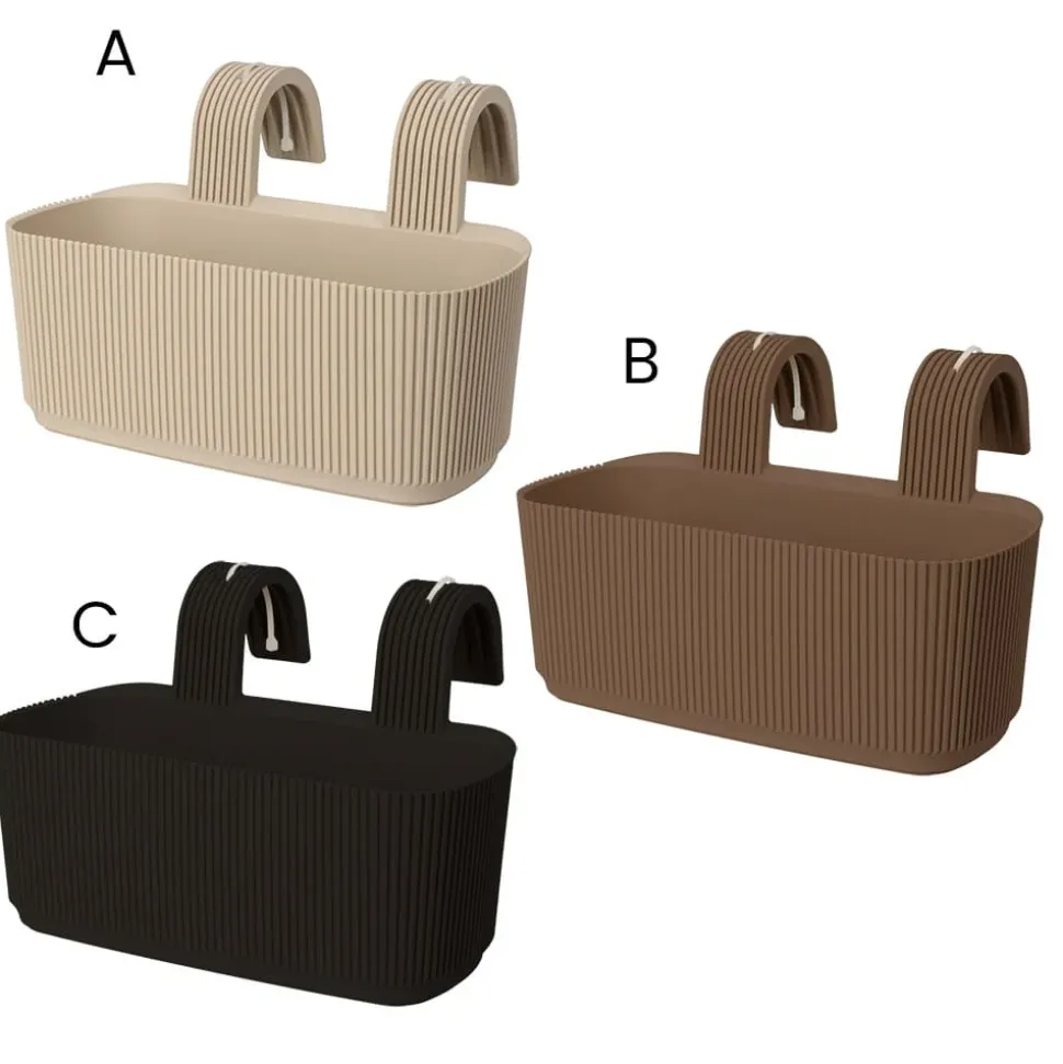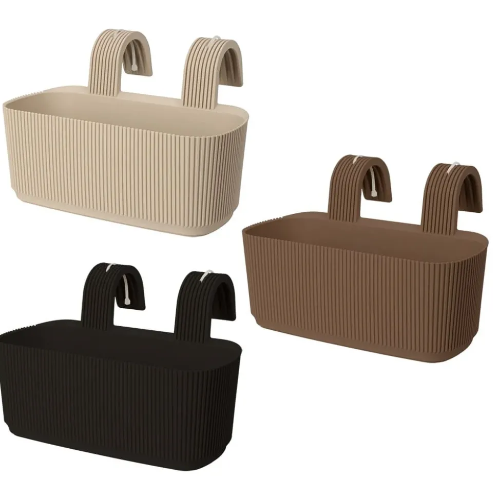 Ribbed plastic railing planter, 7,5 x 11,5″. Brighten up your balcony railings with this ribbed planter that will instantly enhance the flowers and plants you put inside! Choose from 3 colors (beige, brown or black), price per unit.