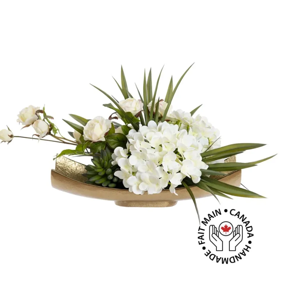 Rose and hydrangea centerpiece. Bring the elegance of white flowers to your table with this artificial centerpiece of lush hydrangeas and delicate roses. All set in a pretty gold metal tray! Perfect as a housewarming gift.